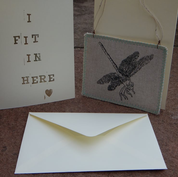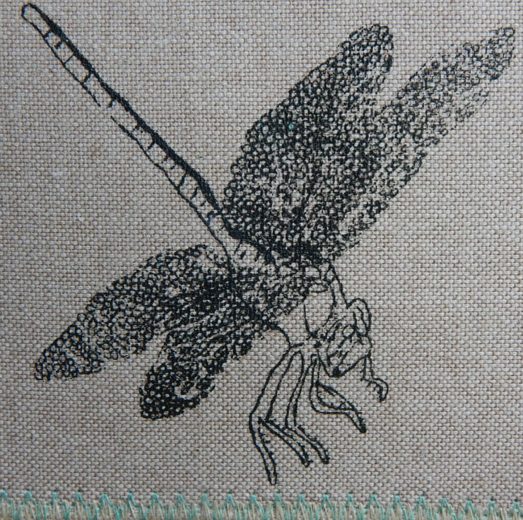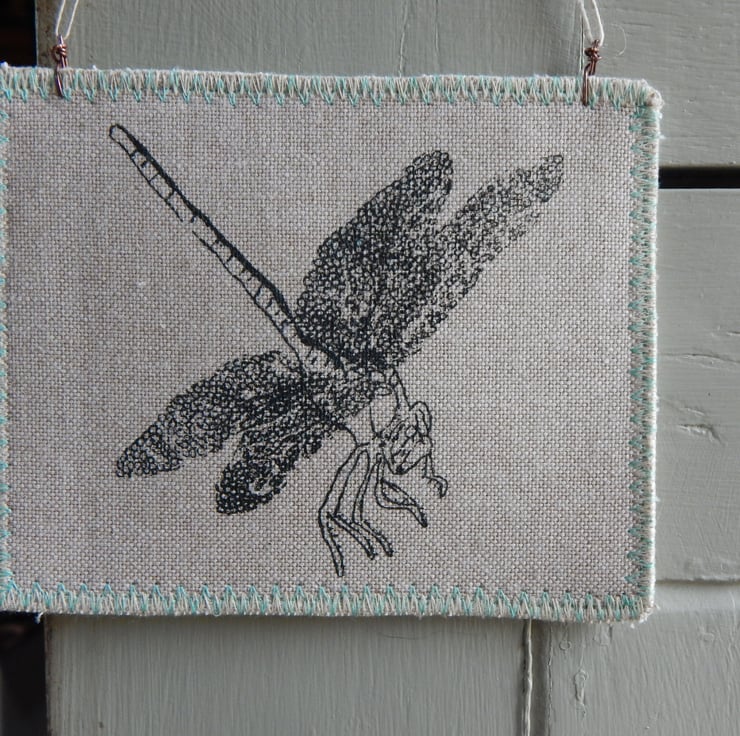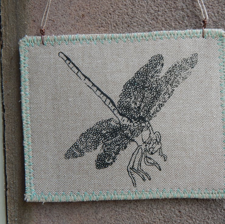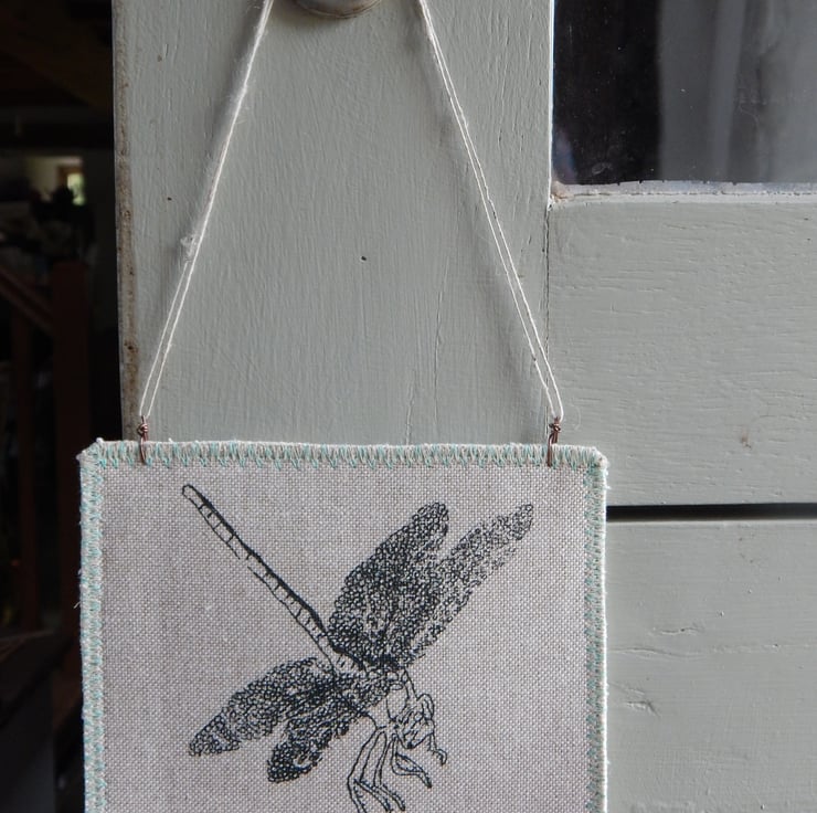 This is a hanger that I have screen printed a dragonfly onto. I have then attached 2 simple metal fixings on top to pop some nettle string to for hanging. The edging has a zig-zag stitching to prevent fraying. There is some blue decorative stitching to the edge.