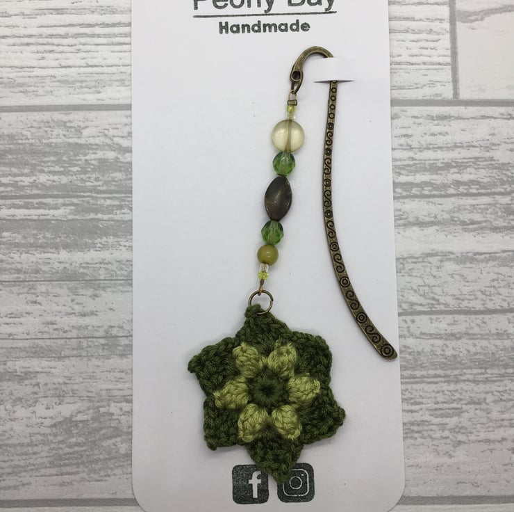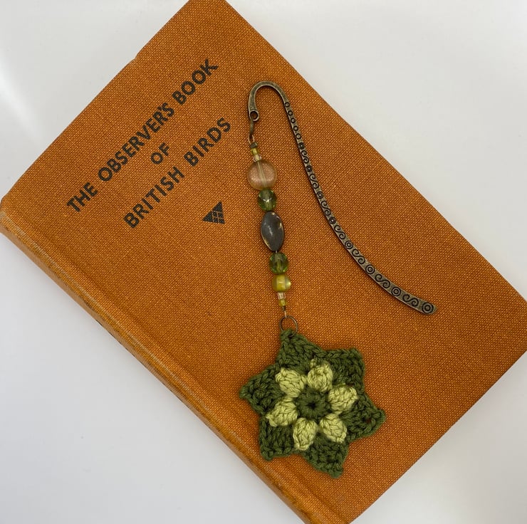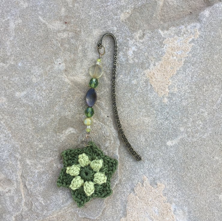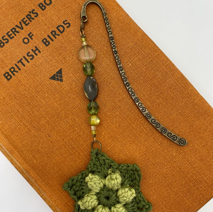 To make this bookmark I’ve combined a crochet flower with upcycled beads. I crocheted the flower in lovely shades of khaki and olive green cotton. I added a mix of beads in complementary shades and set it on a bronze tone bookmark.