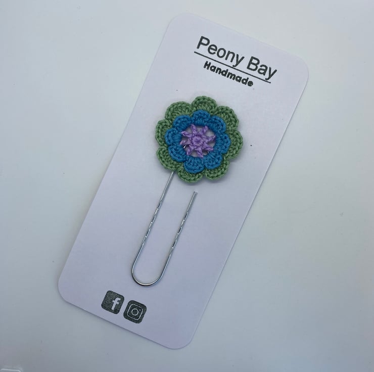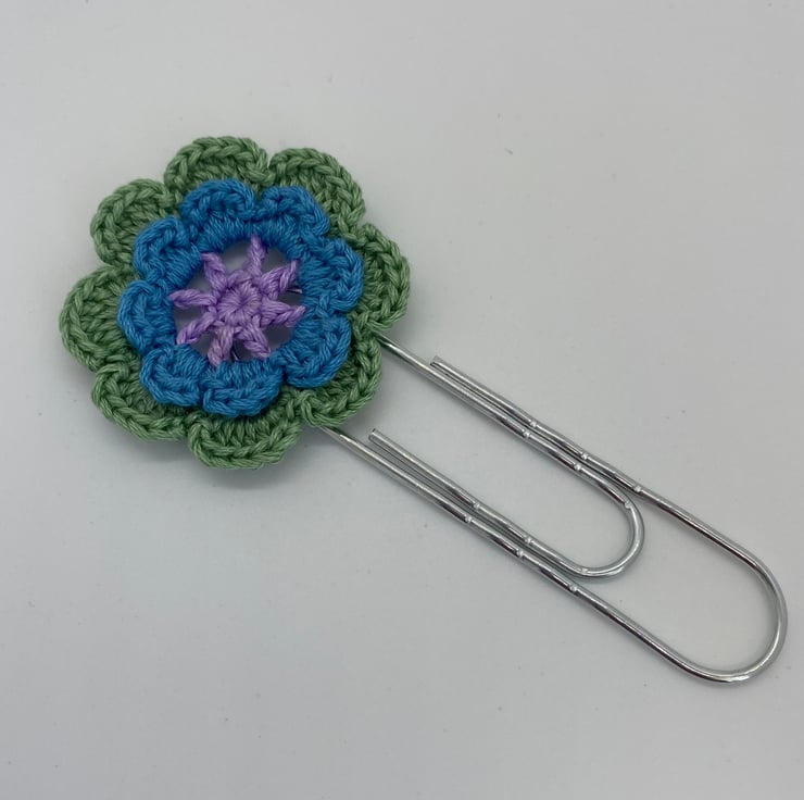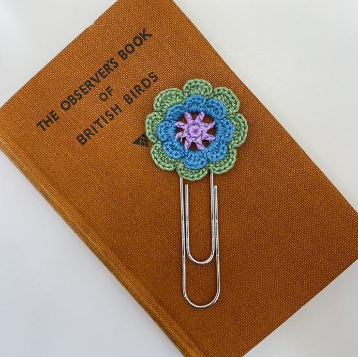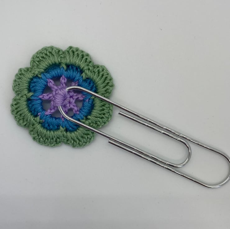 To make this pretty bookmark I used lilac cotton to crochet the centre of the flower, then crocheted the first layer of 8 petals in blue cotton and the second layer of petals in green cotton. I crochet over the top of the bookmark so the flower is perfectly secure, it does move but it can’t come off (unless you slide it along the shape of bookmark!).