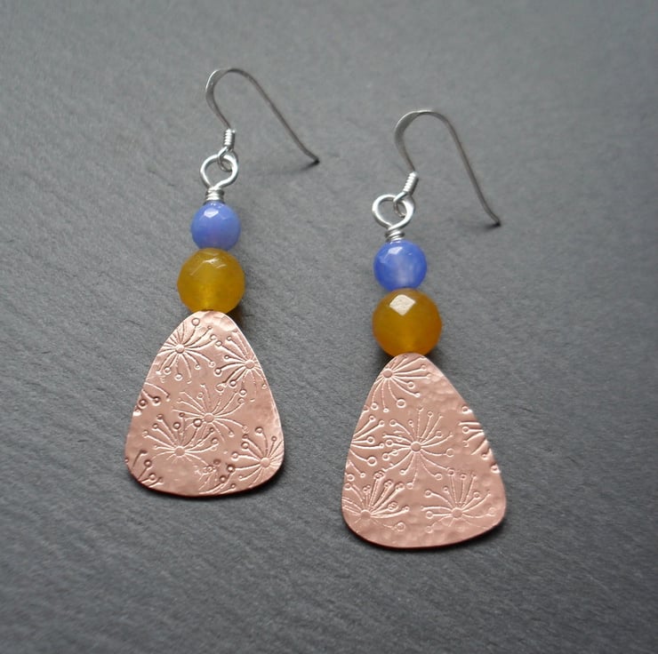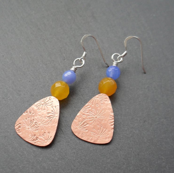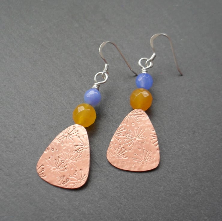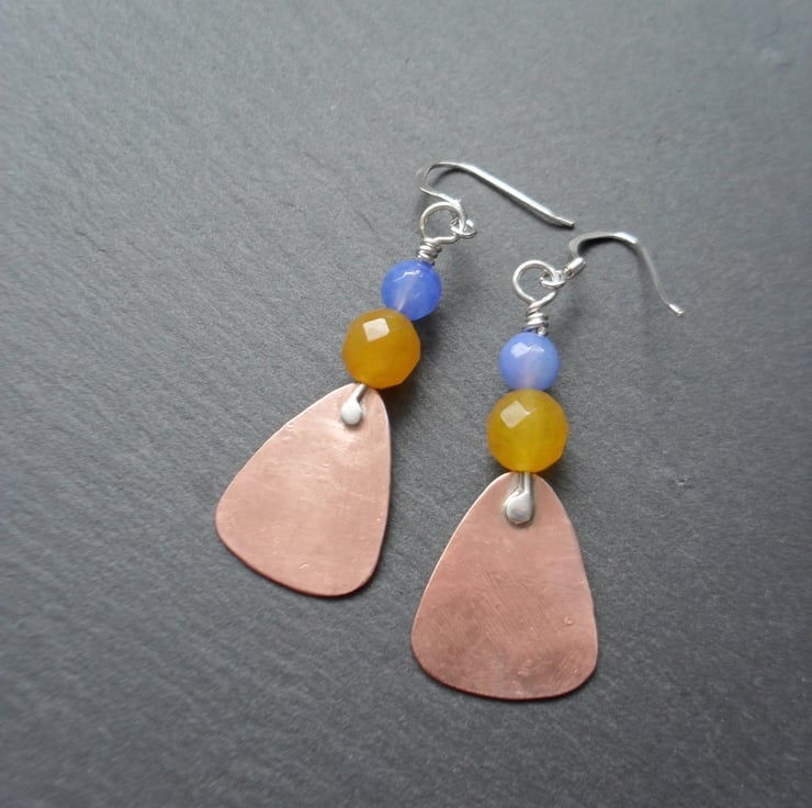 Sterling silver wire has been soldered to the back of the copper with quartzite semi precious gemstones attached in yellow and a lilac/blue colour.