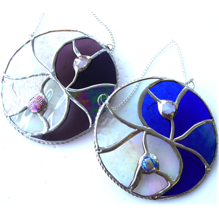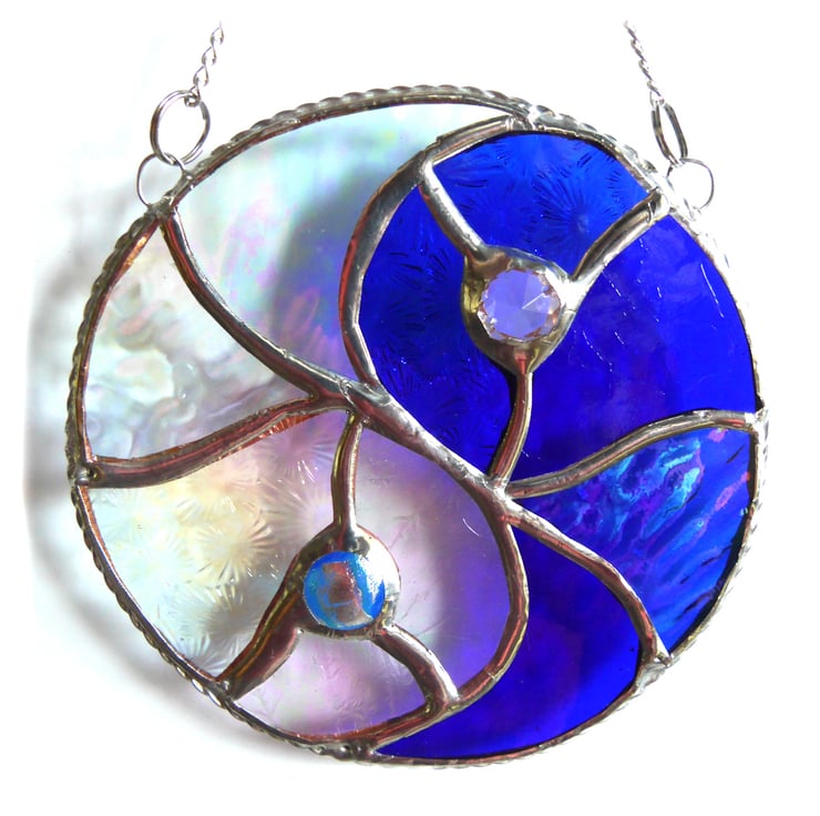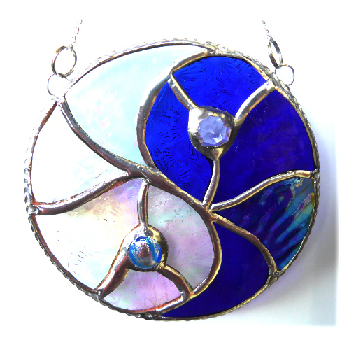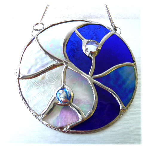 One half is made from 4 types of bright blue glass and the other from 4 types of clear iridescent glass. Although the beauty of this symbol is in its simplicity I've used artistic licence and added movement with different textures and shades.