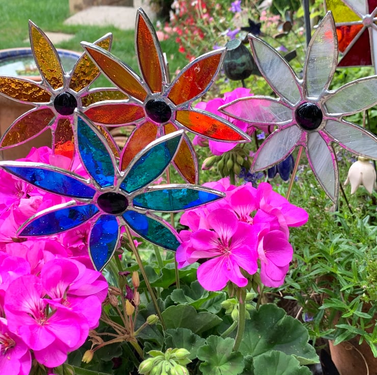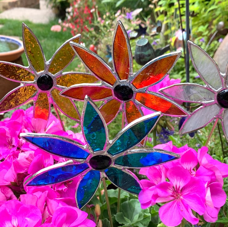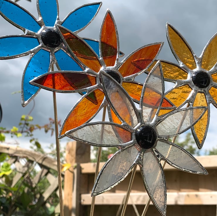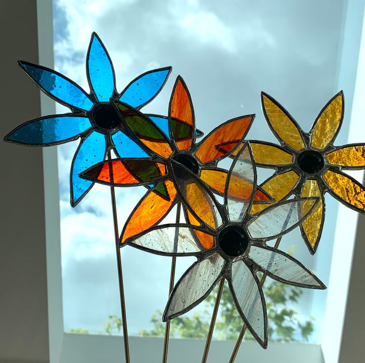 Each piece of glass has been hand cut, ground, foiled and soldered together, a black glass nugget has been used for the centre of the flower, copper coloured rod has been attached which measures approx 30 cms, this can be cut if you would like it shorter.