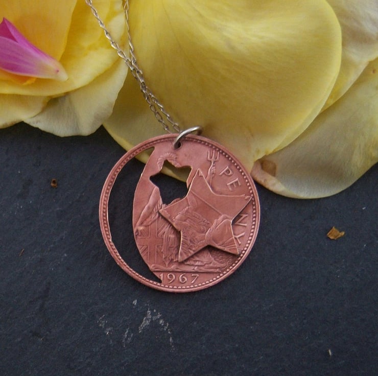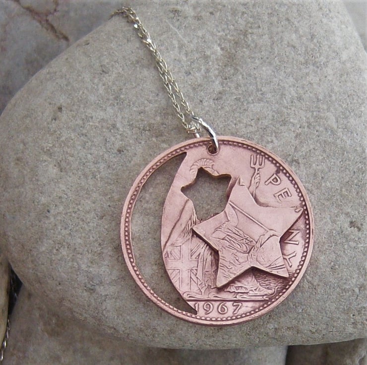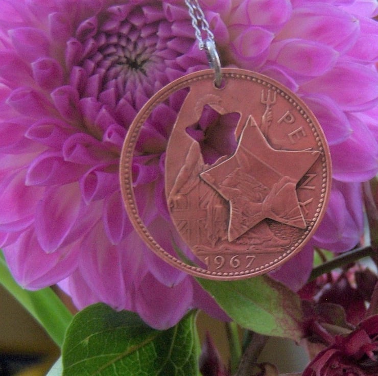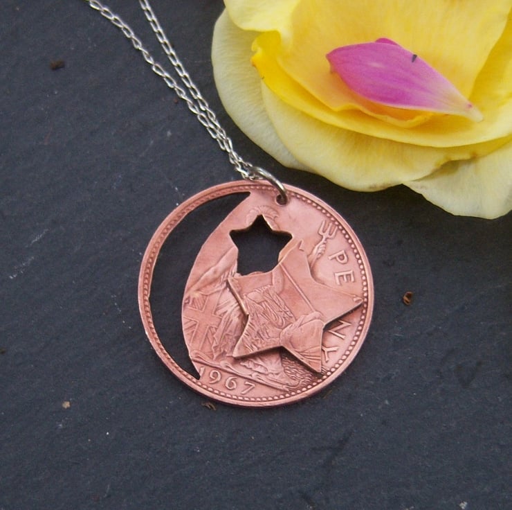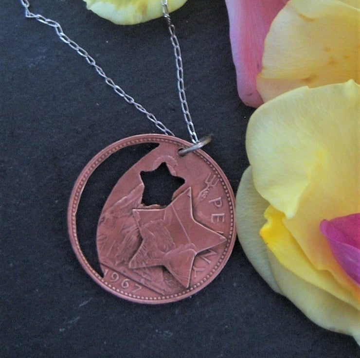A moon and star cut from a pre-decimal 1967 bronze penny coin. Another piece of coin has been cut into star shape and soldered to the front. All the coins I cut are done by hand, with a fine-bladed saw, not with a laser machine. Approximately 3cms across.