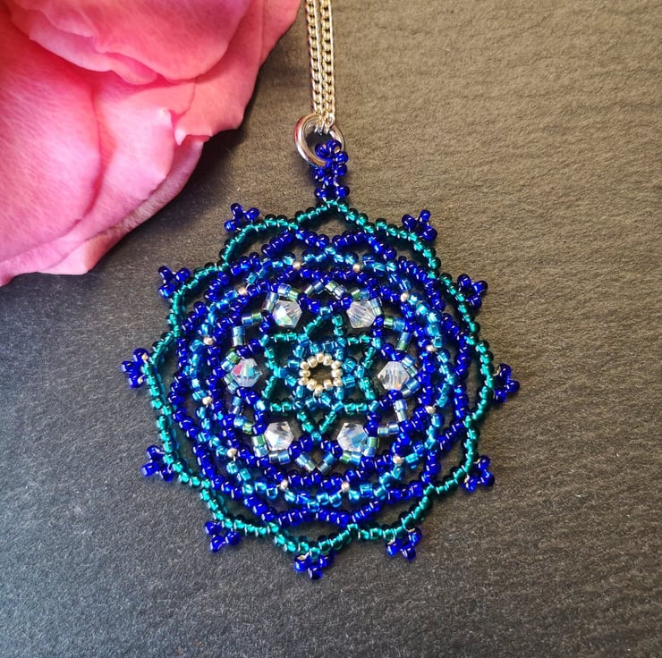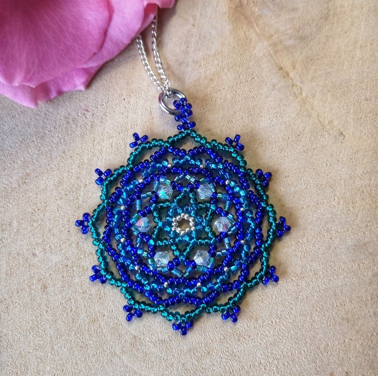 Hand stitched mandala necklace using specialist needle and beaders thread. This intricate work is created by weaving seed beads of varying sizes and combining them with beautiful Clear ab Preciosa crystals.