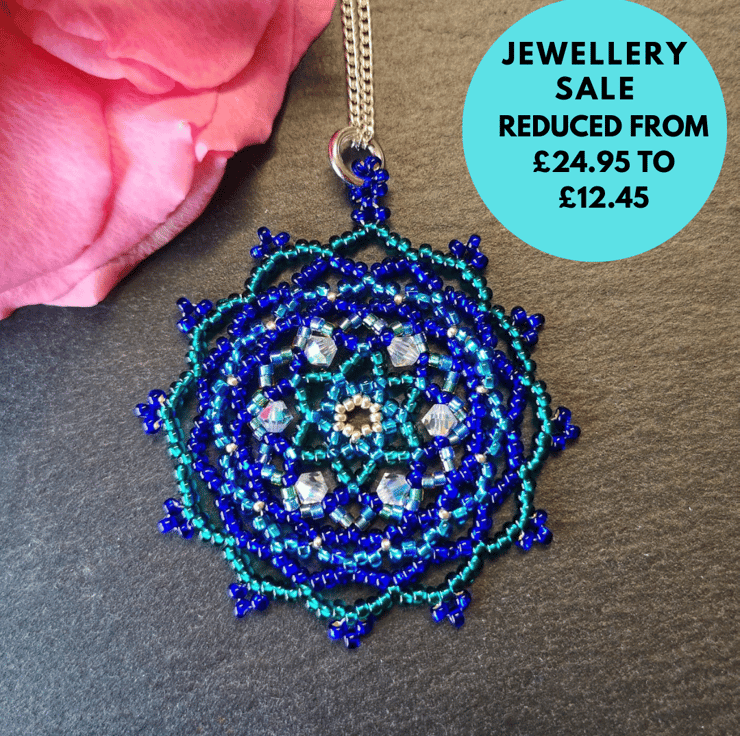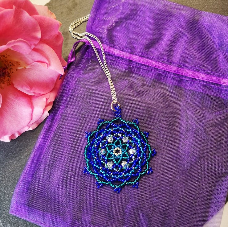 I love the beautiful mandala dreamcatcher effect of this hand stitched pendant and enjoy experiment with colour and beadwork techniques.