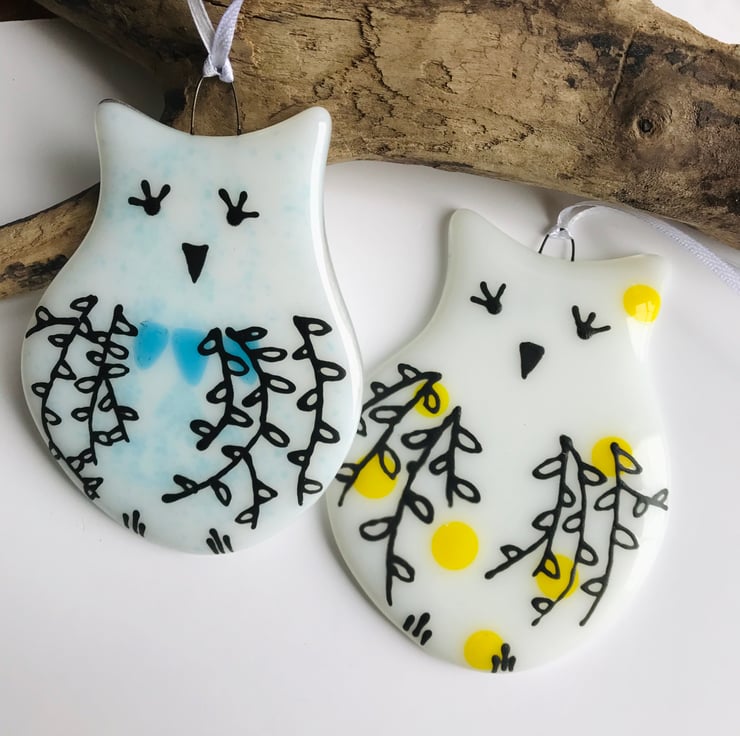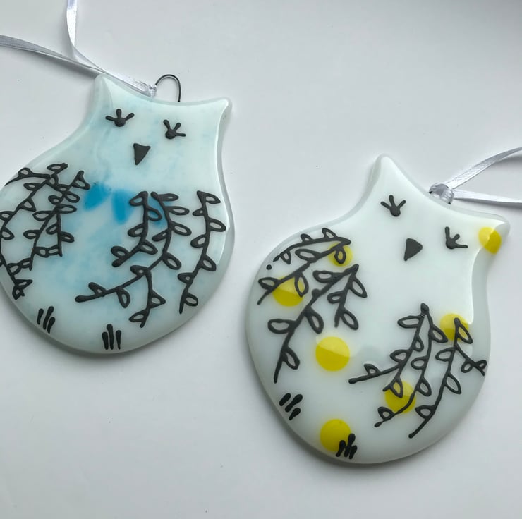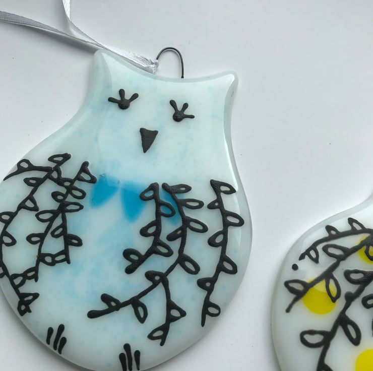 The owl is made from two layers of hand cut glass, a clear glass on the bottom and a white glass on the top. I then added colour to glass and fully fused in the kiln. Once the glass was cold I then painted the eyes and additional details. This owl measures proximately 10 cm in height.