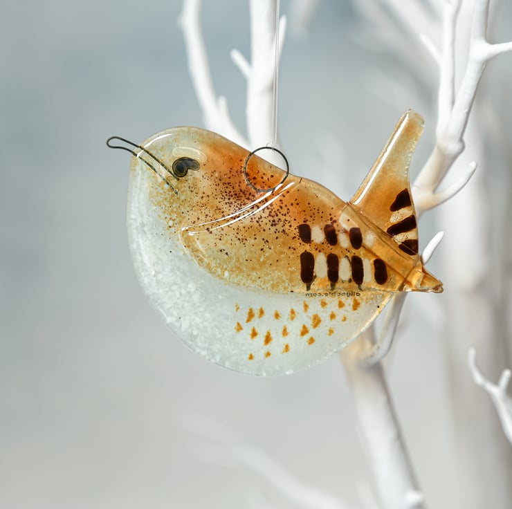 The small naturalistic bird is very delicate looking and hangs from a fluorocarbon line which has a matching bead at the end, ready to hang at a window or even outdoors in a sheltered position.