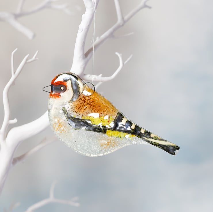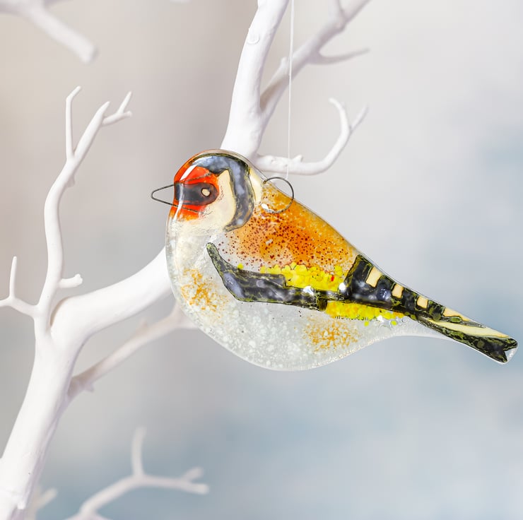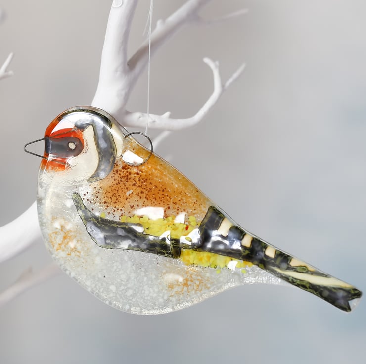 My birds are made from 2 layers of thin glass. To this I add ground coloured glass and wire. The detail is painted using glass enamel. Finally the surface is over-glazed and fired in a kiln.