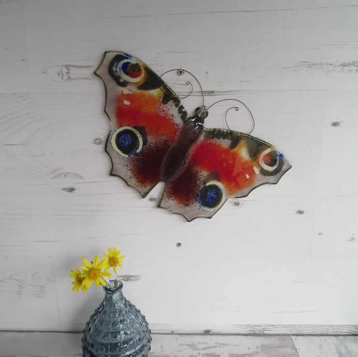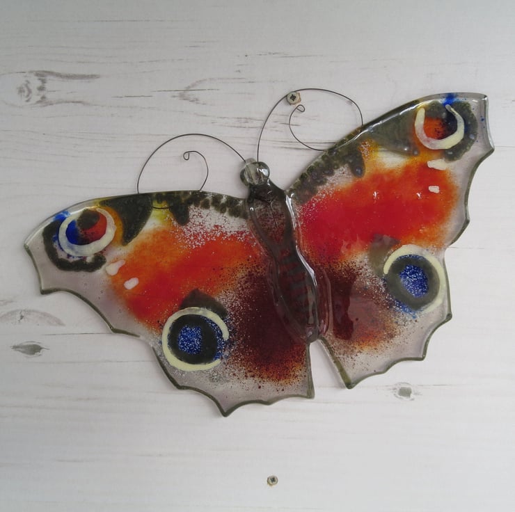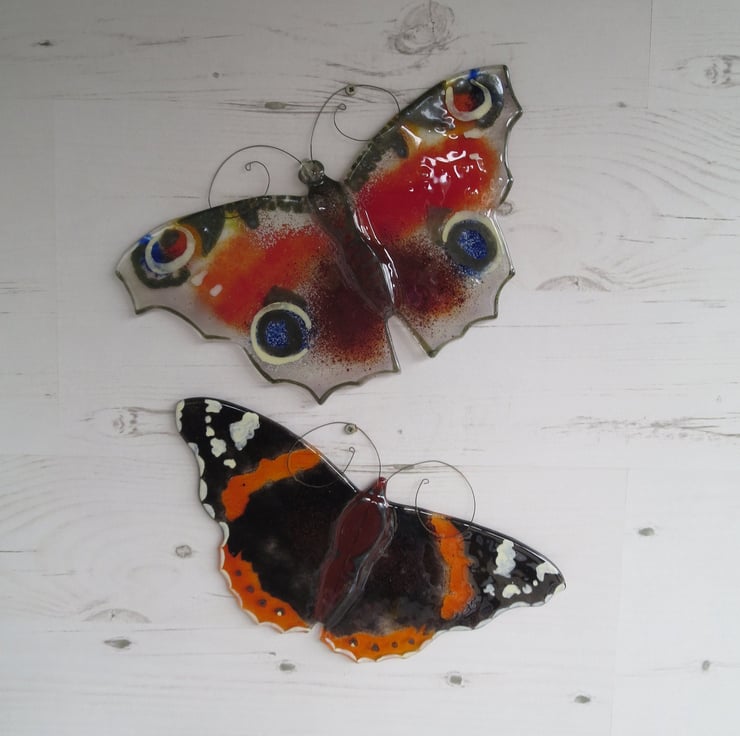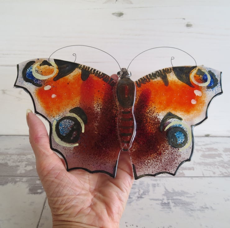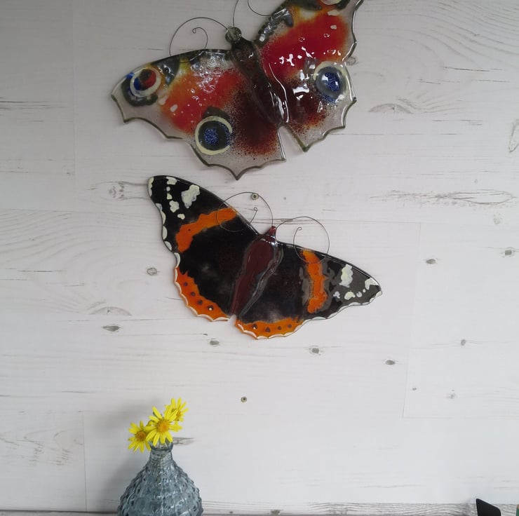 My butterfly is made from 7 pieces of thin glass. The Peacock has an extra piece over the other butterflies as I wanted to give him eyes! I paint with enamels and add ground coloured glass and wire. Finally the surface is over-glazed and fired in a kiln.