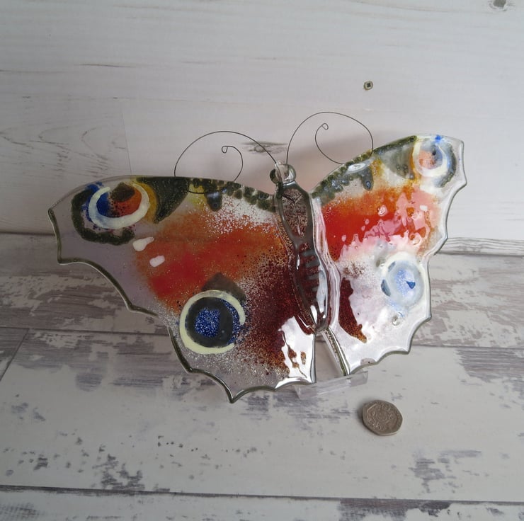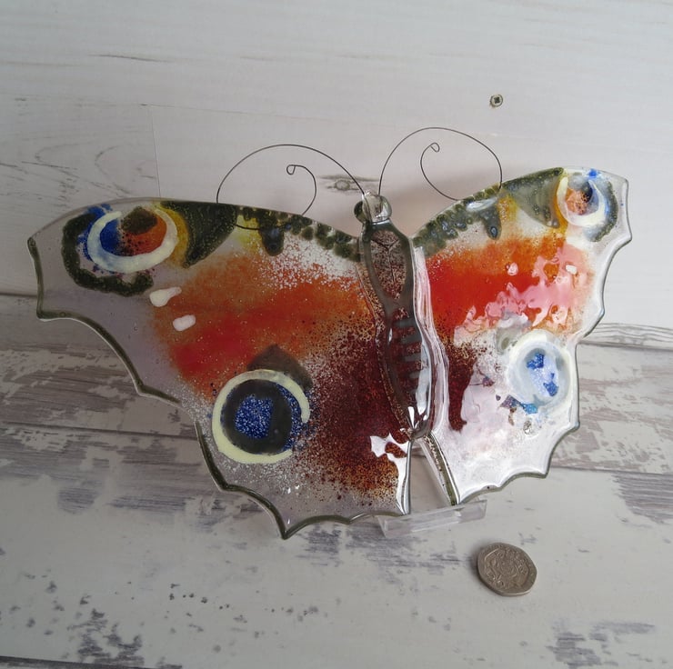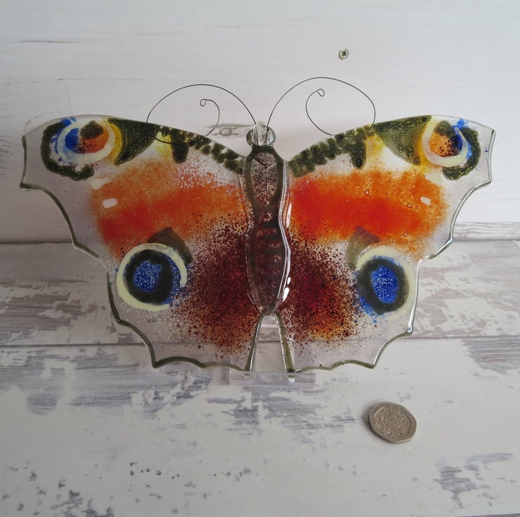 The first picture is the butterfly hanging from an antennae, these are trapped in the glass so very strong. The next pictures show the work with a UK 20p coin for scale and angled to show the light behind the piece. The last image show it with the red admiral for scale and grouping.