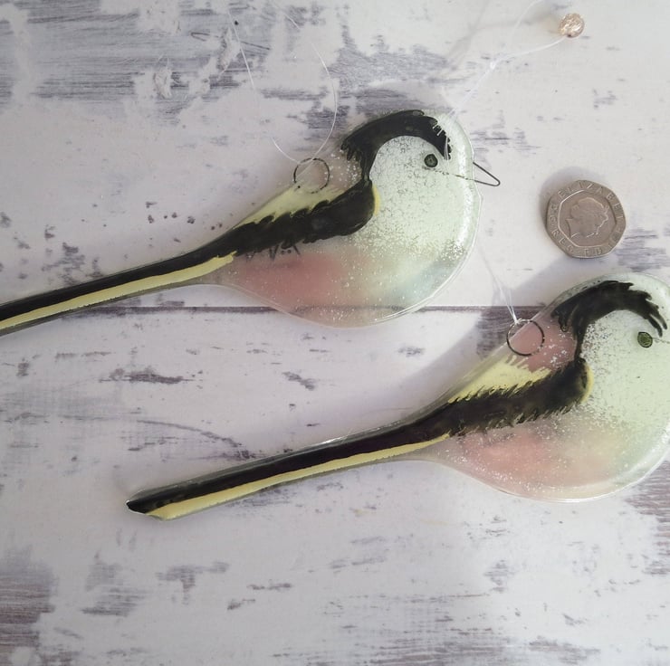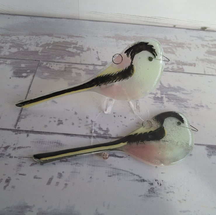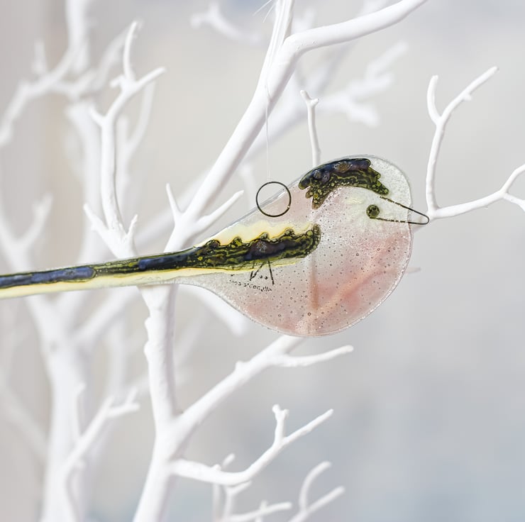 My birds are made from 2 layers of thin glass. To this I add ground coloured glass and wire. The detail is painted using glass enamel. Finally the surface is over-glazed and fired in a kiln at over 800'C.