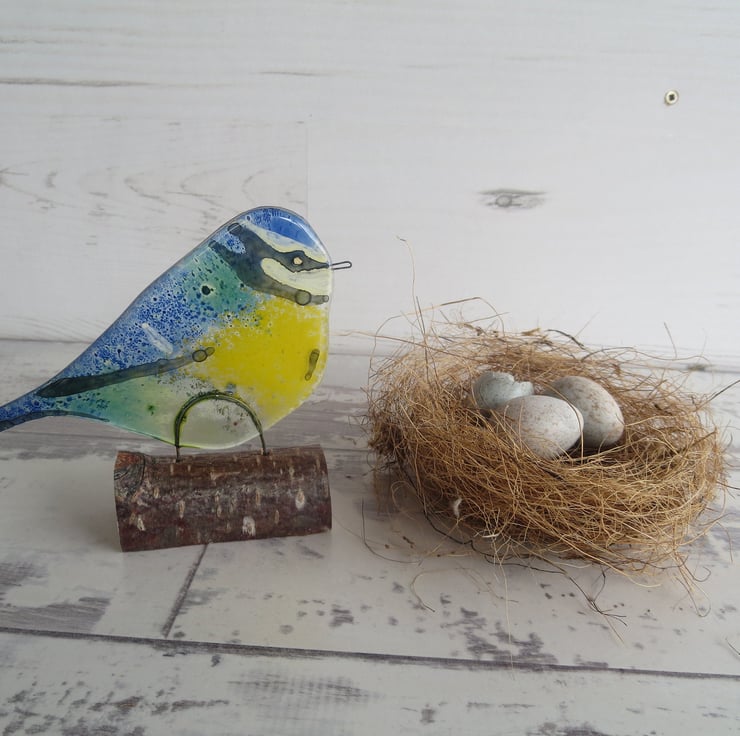 A beautiful fused glass blue tit sitting on a branch, an ideal gift for a bird lover.