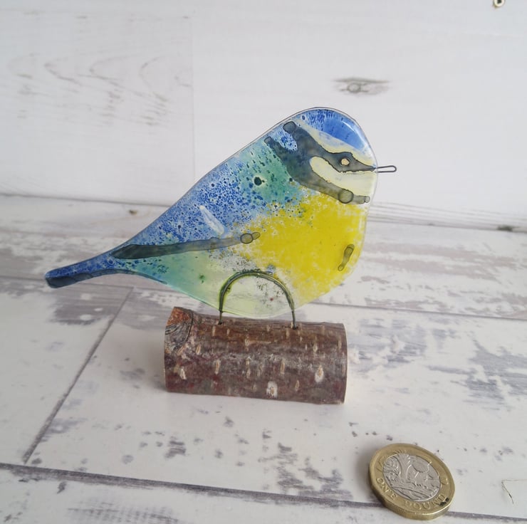 Each bird is made from 2 pieces of thin glass with powder added to give the characteristic colours. His beak and little legs are made from wire which is inserted between the two pieces before the tit is placed into the kiln for firing.