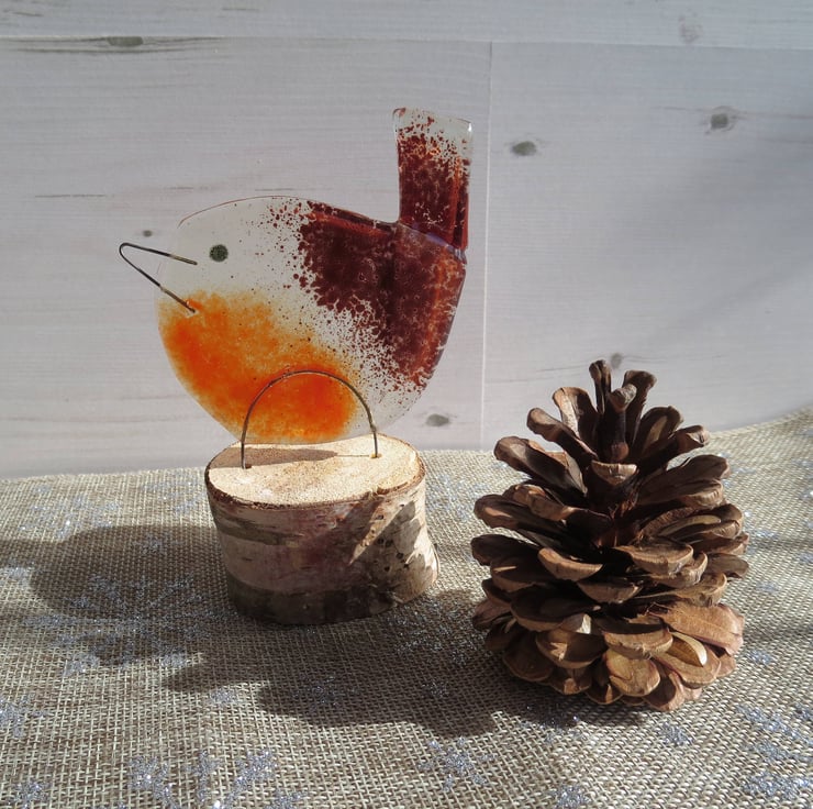 A cheeky chirpy fused glass robin sitting on a log, an ideal Christmas gift.