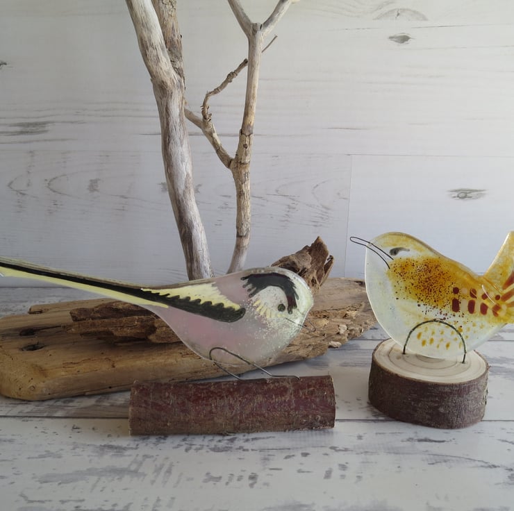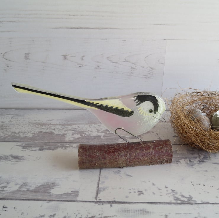Each bird is made from 2 pieces of thin glass with painted powder to give the characteristic colours. His beak and little legs are made from wire which is inserted between the two pieces before the tit is placed into the kiln for firing.