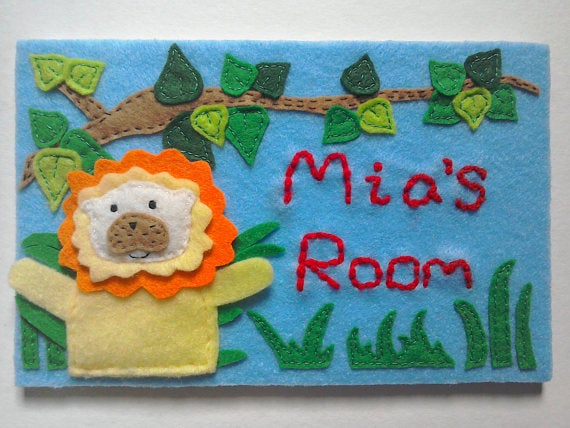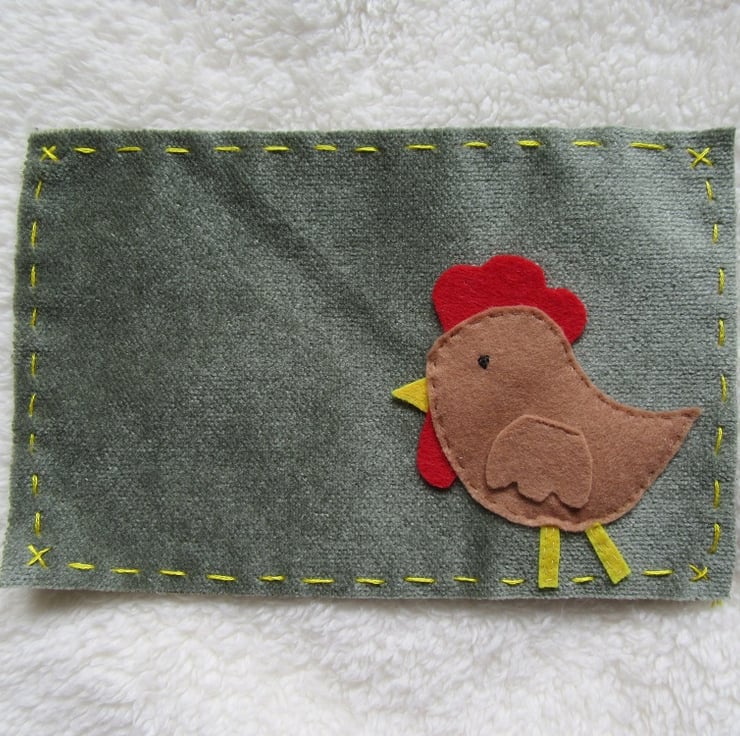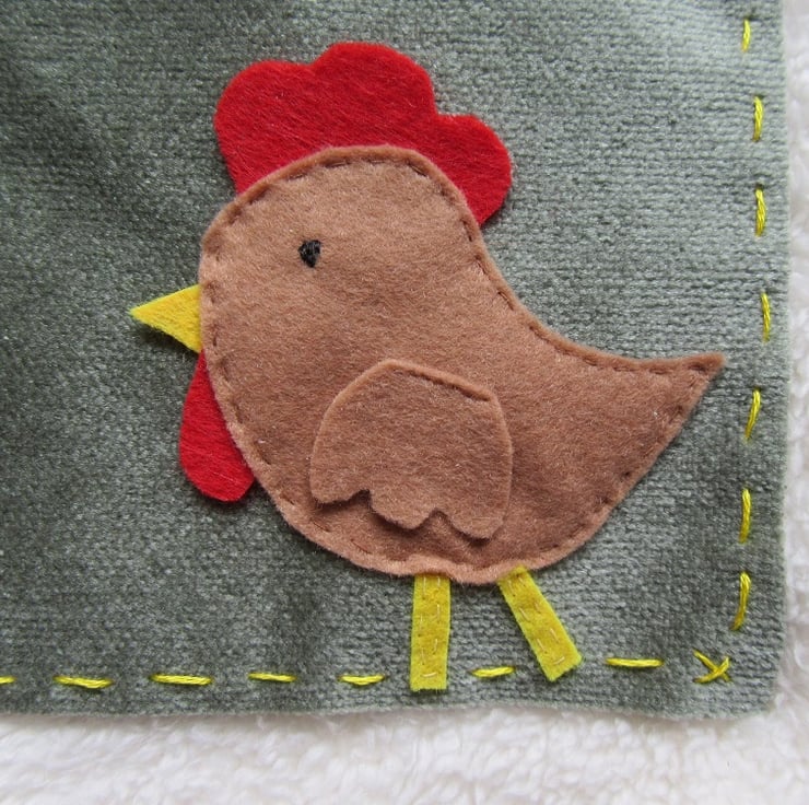 This cute farm themed door sign is made from green fabric with a hand cut and stitched brown felt chicken with added embroidery detail around the edge, it is backed by a MDF board painted white, and can be attached to a wall or door with the sticky pads provided.
