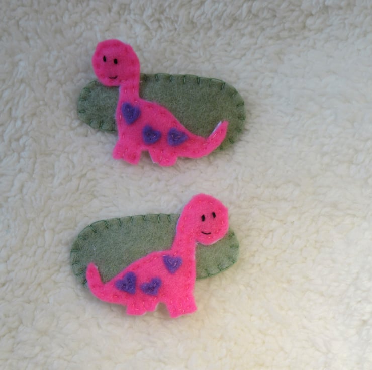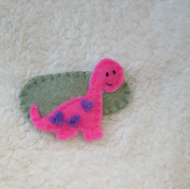 Colourful felt pink Diplodocus dinosaur hair clips, a fun toddler accessory and inspired by my love of geology and fossils (although I have never found a dinosaur fossil yet!)