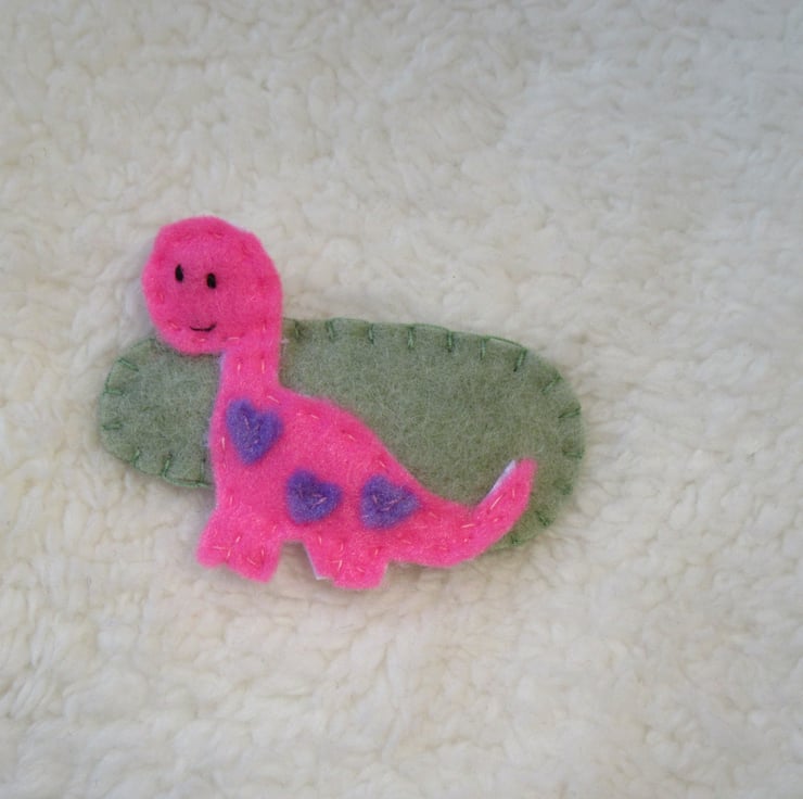 Each dinosaur hair clip is hand cut and stitched by me from my dining room table using my own design cut from pink felt, with purple hearts. As each is handmade they will all have their own unique personality.