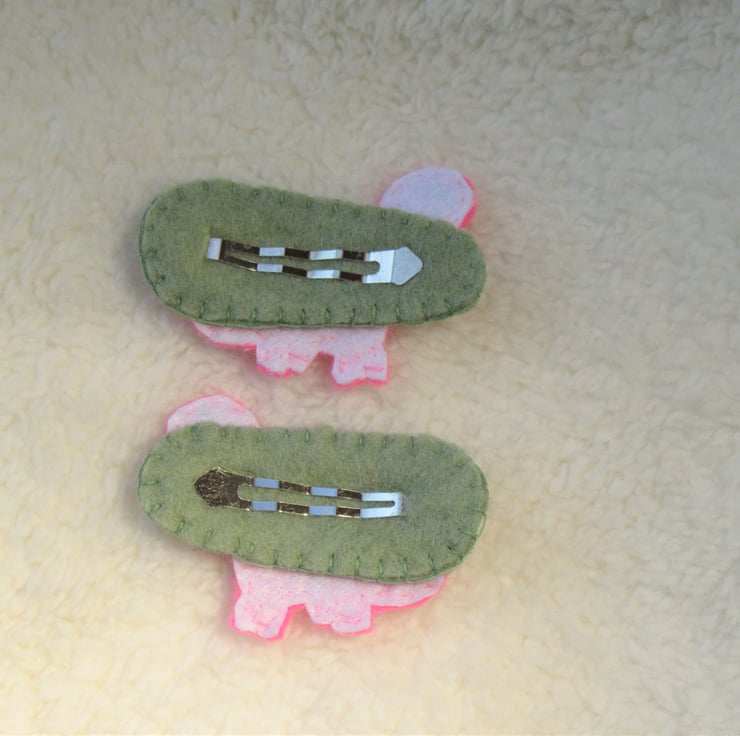 They are attached to a metal snap hair clip by 100% green wool felt.