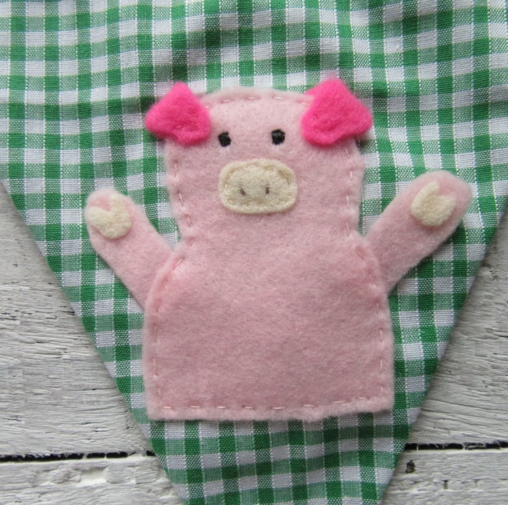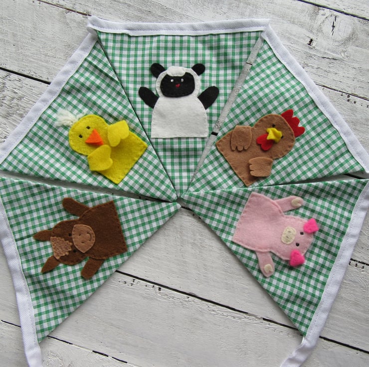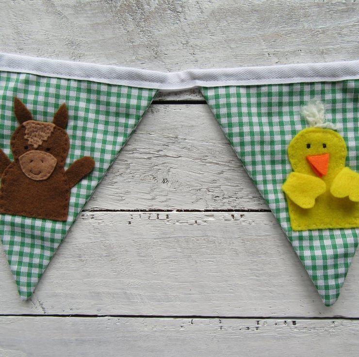 Each flag on my farm animal bunting is double-sided in gingham fabric, with green and white checks. There are 5 flags on this bunting, attached with white cotton tape.