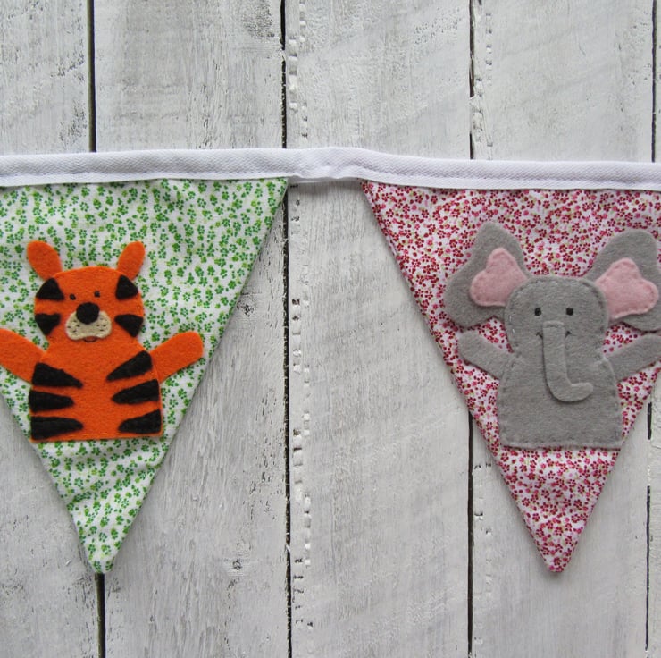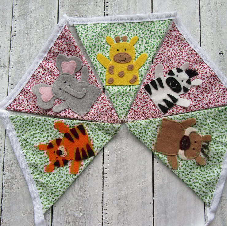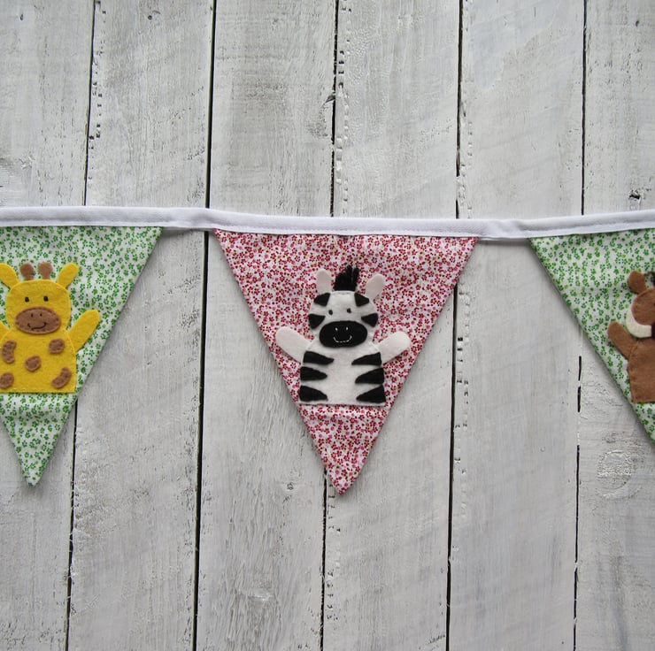 Each flag on my zoo themed animal bunting is double sided in cotton fabric with the same mottled print. The bunting is made up of 5 flags : 3 green, 2 red.