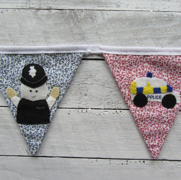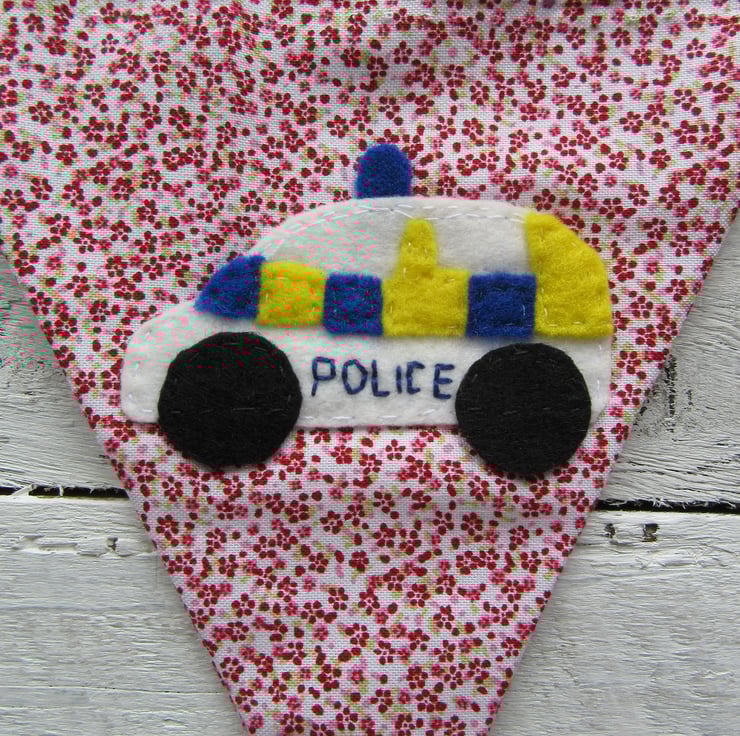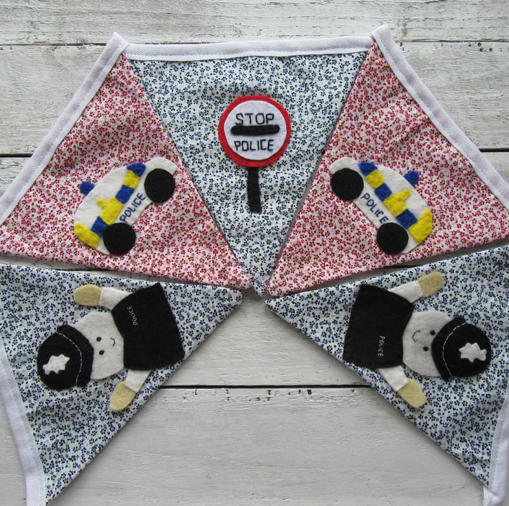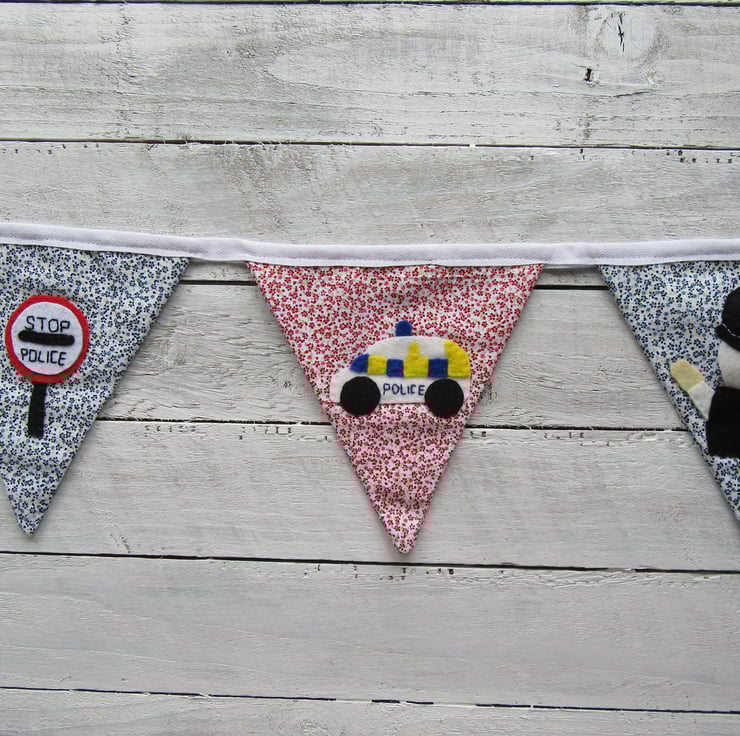 This police bunting is made up of 5 flags, 2 red ones, 3 blue ones. Each flag has a felt police themed motif, each cut and stitched by hand from my own design.