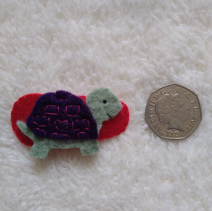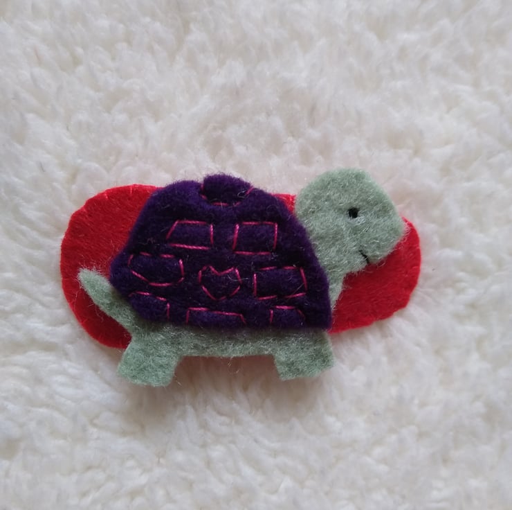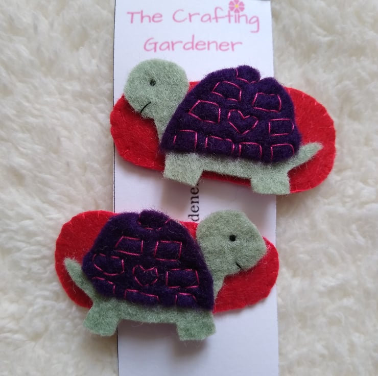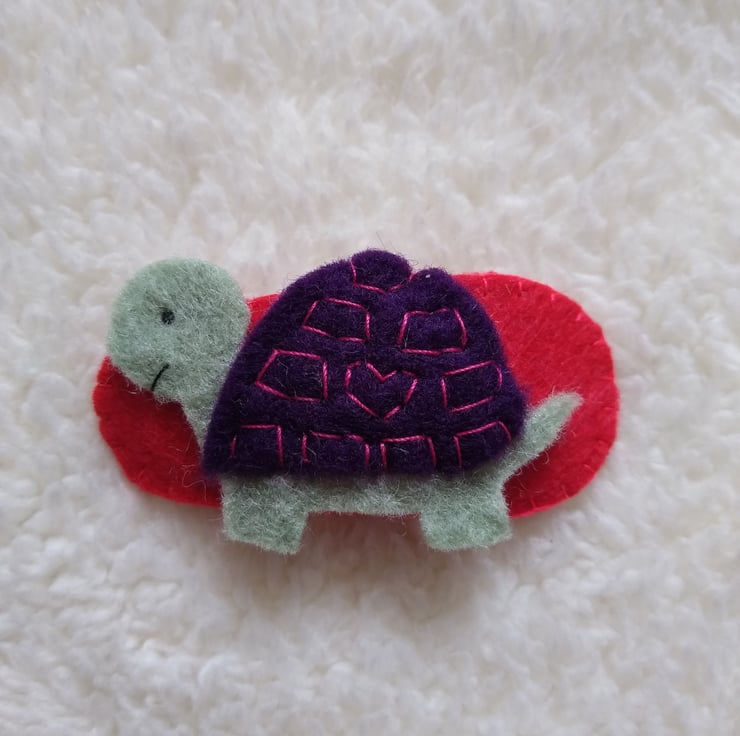 Each tortoise hair clip is cut and stitched by me from hand using my own design using 100% green wool felt and purple acrylic felt. As each is handmade they will all have their own adorable character.