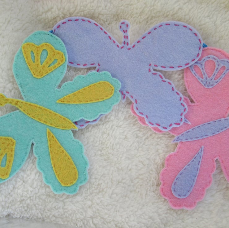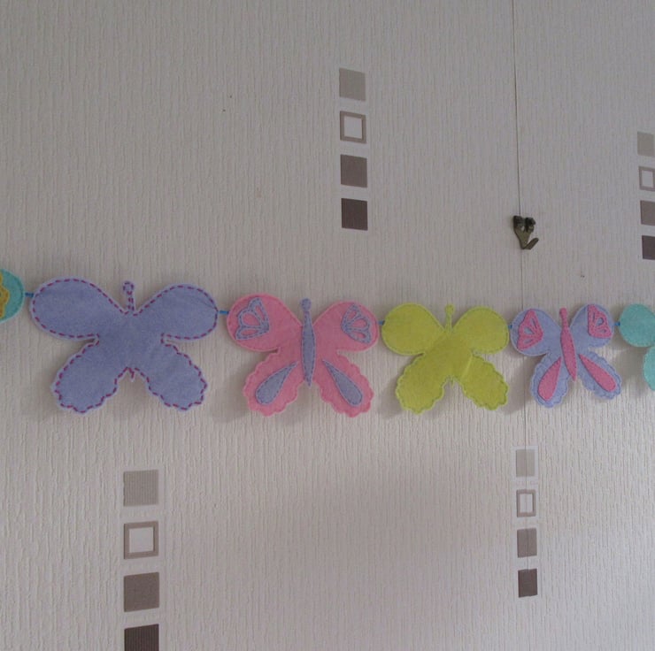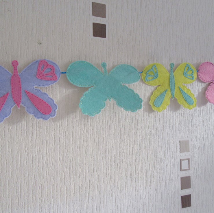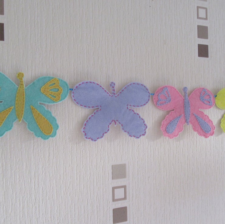 The felt butterfly garland consists of eight pastel coloured butterflies: - green, purple, pink and yellow. Four have contrasting coloured applique details. Four are plain. (see photos for colours)
