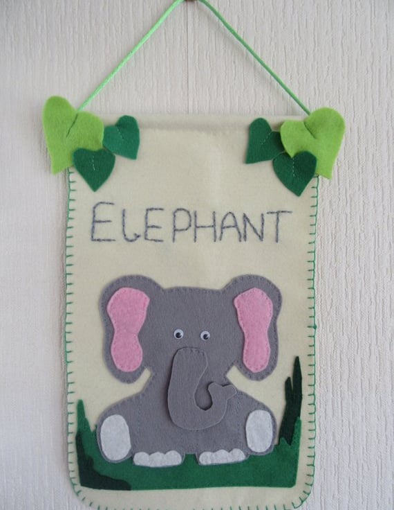 This cute elephant wall hanging is made from cream acrylic felt, with a hand appliqued elephant, with cute googly eyes to add character. The writing is hand embroidered in embroidery thread.