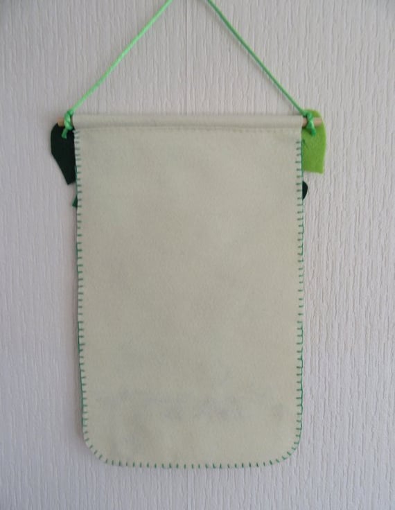 The wall hanging is backed by another piece of cream felt, glued and sewn for extra strength. It is finished off with green thread blanket stitch, which frames the edge.