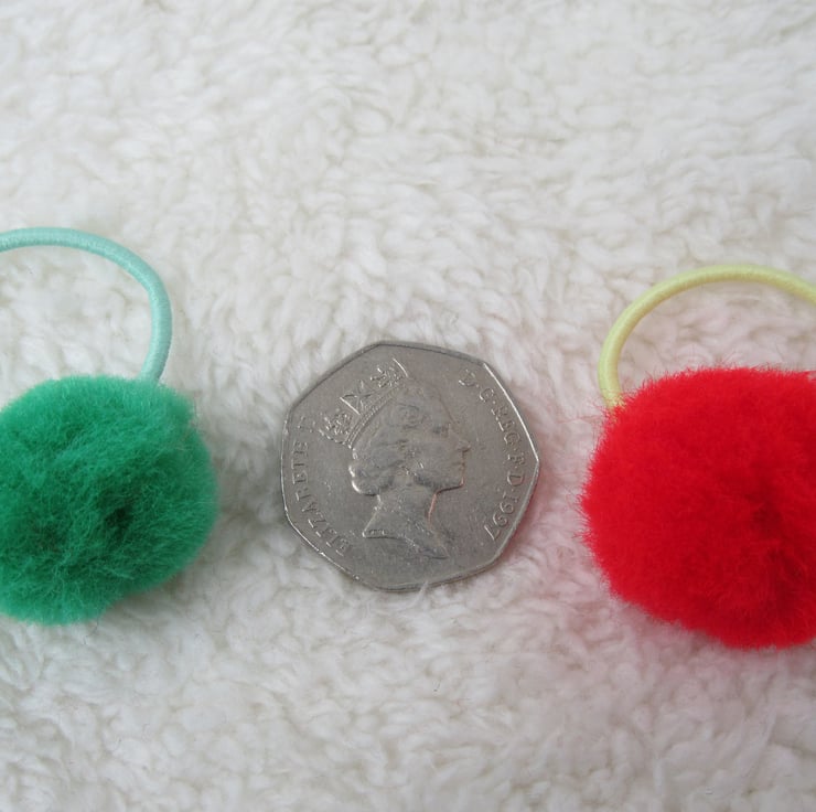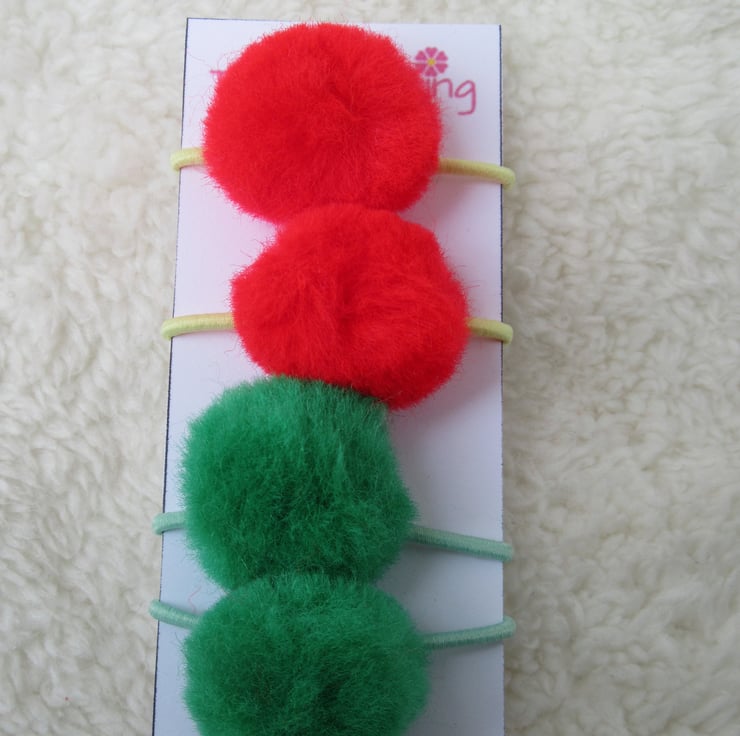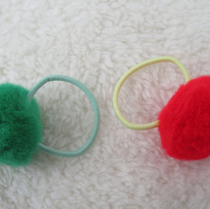Red and green pom poms on green and yellow hair bobbles. Great for mix and match with pigtails or double up on a ponytail.