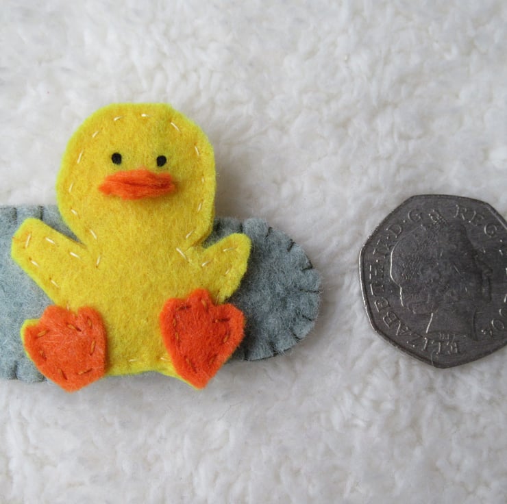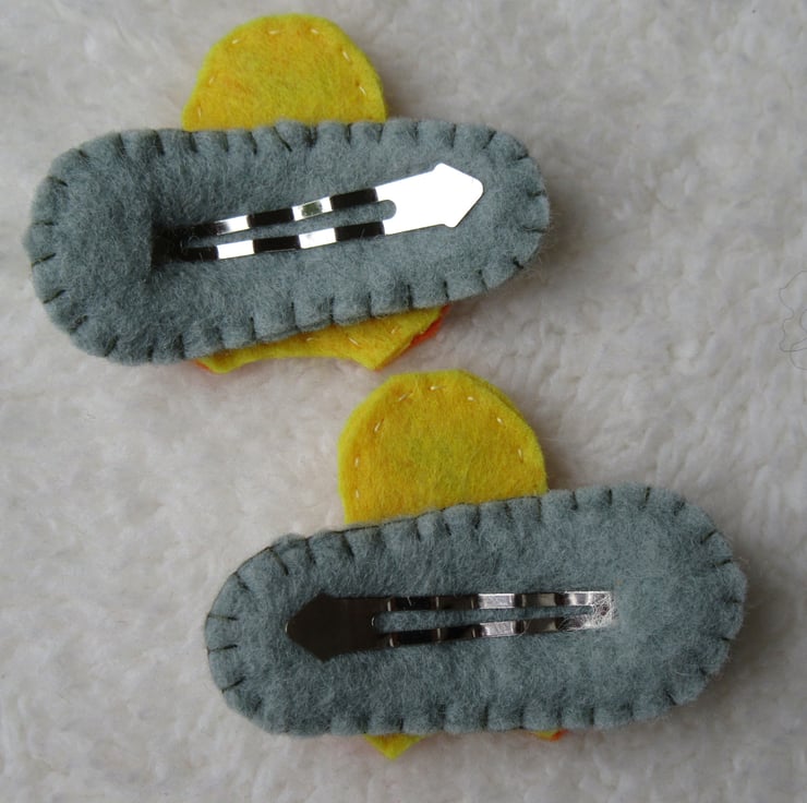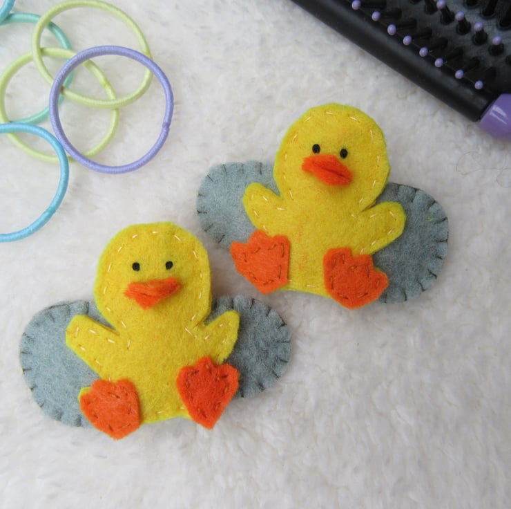 These little duck hair accessories are all hand cut and stitched by me from my own design using acrylic yellow felt, with orange feet and beak and hand-stitched embroidery thread eyes. Each one has its own individuality.