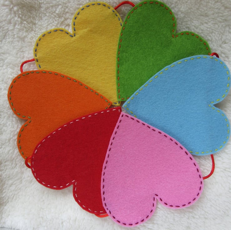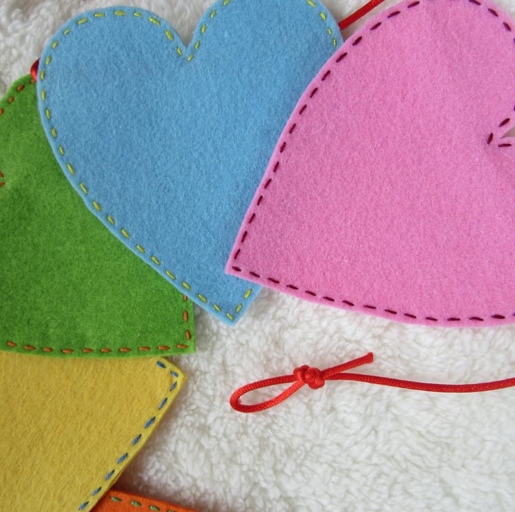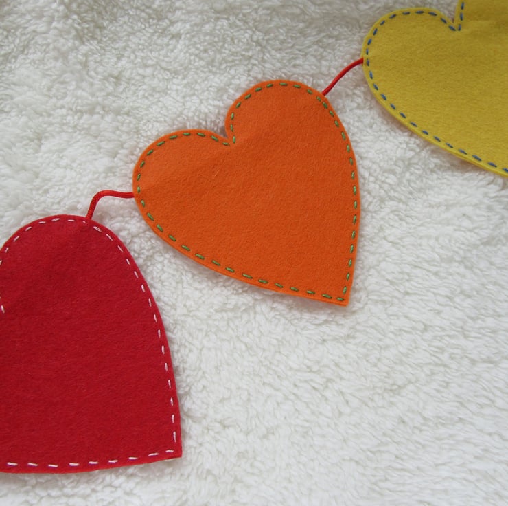 Each rainbow garland is hand-cut by me from my home in Herefordshire from hardened acrylic felt and stitched with contrasting embroidery thread. The hearts are attached to red cord, with loops on the end for hanging.