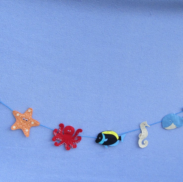 Created to bring colour and cuteness into your child nursery, with a touch of learning as well, this adorable sea creature felt nursery garland will add a touch of the tropical ocean to your child's bedroom decor.