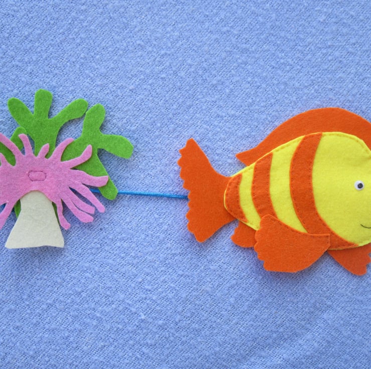 The felt animals are attached to a strong light blue cord, with loops at both ends, covered by a pink anemone and green seaweed. This means the garland is easy to hang and can be moved easily.