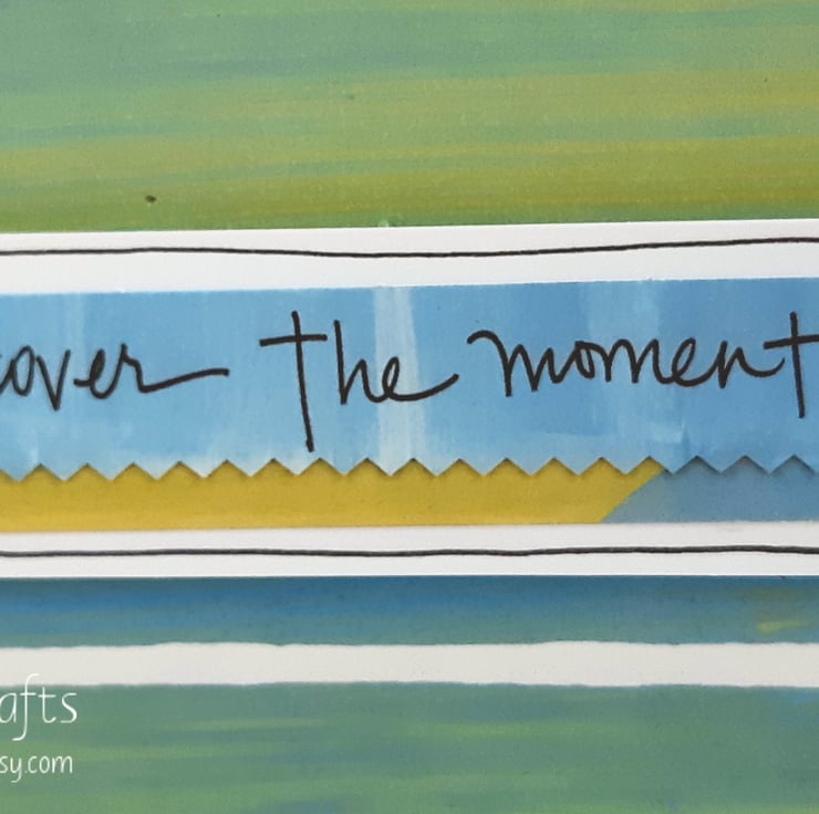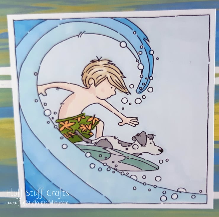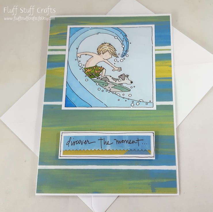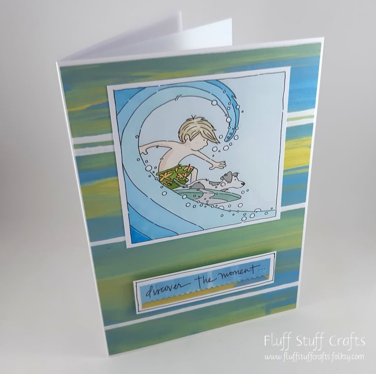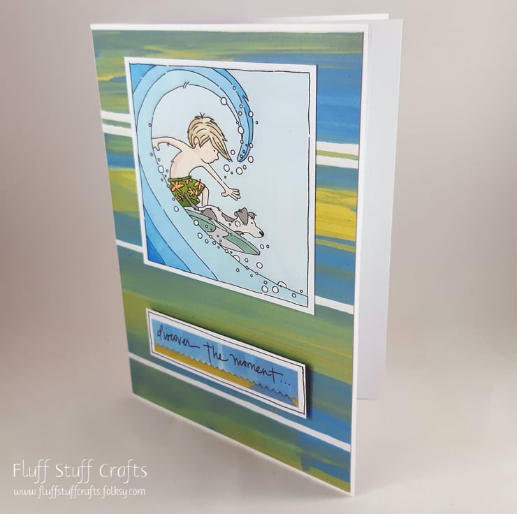 Blank card, suitable for birthdays or other occasions, featuring a hand coloured image of a boy surfing with his dog. The image has been overlaid onto coordinating striped background card, together with the inspiring sentiment 'discover the moment...'.