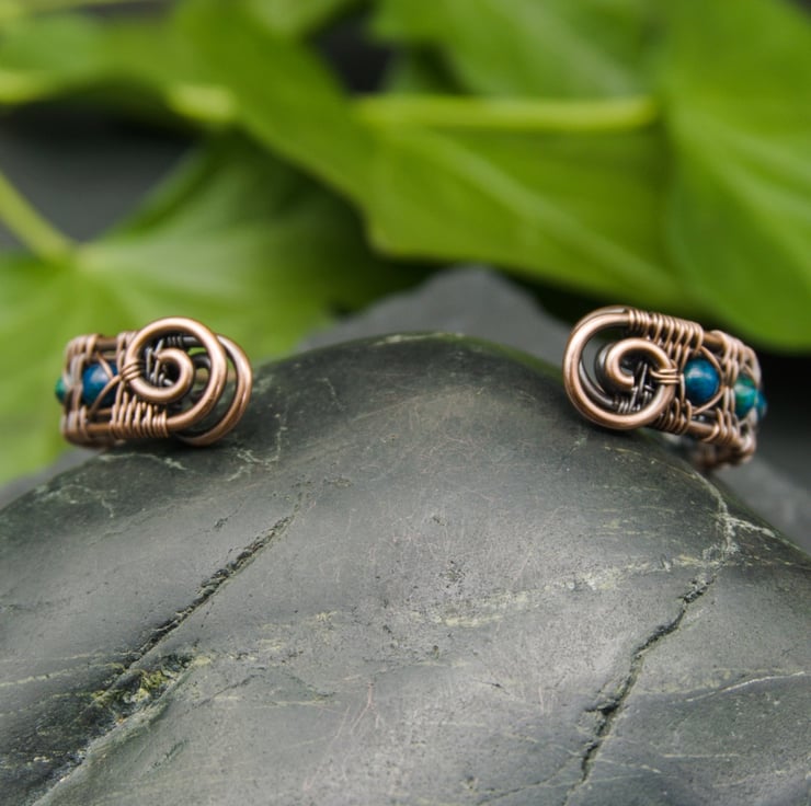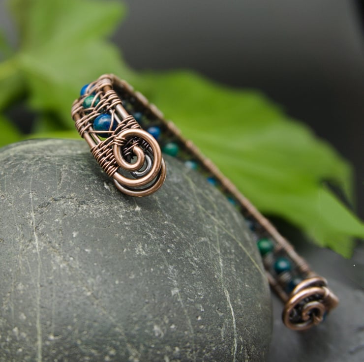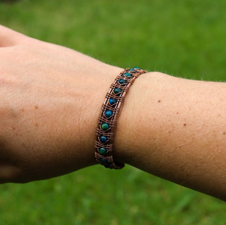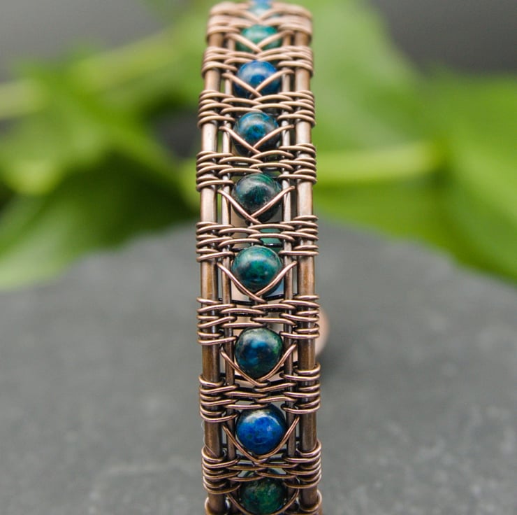 This beautiful cuff has been handmade from copper wire & features 4mm round Chrysocolla beads. I've used a variation on the snake weave, adding the beads into the middle of the band with each bead separated by two rows of weaving. Chrysocolla is a gorgeous blue & green mottled stone which looks stunning with copper. Each bead is different & there are a variety of blue & green shades in this bracelet, making it a striking & unique piece of jewellery.