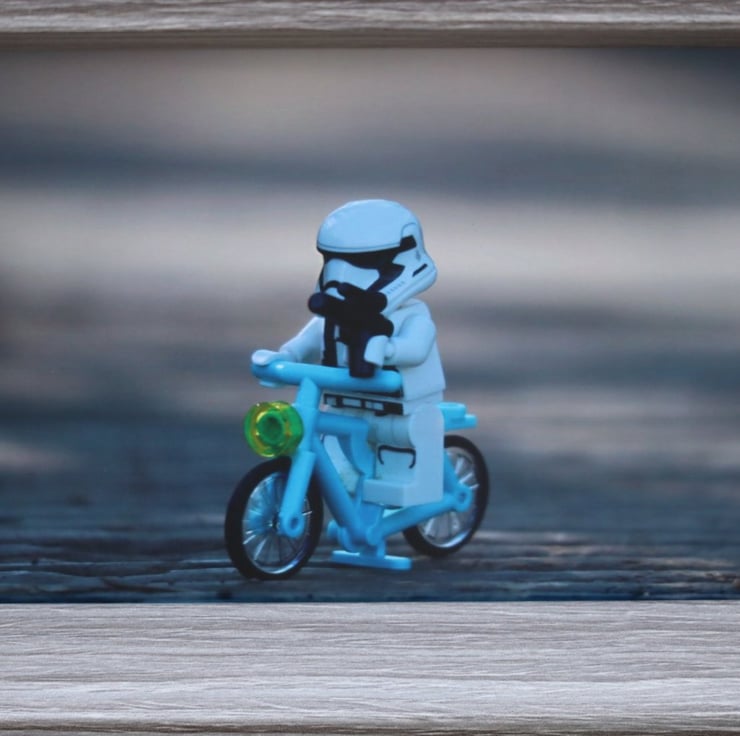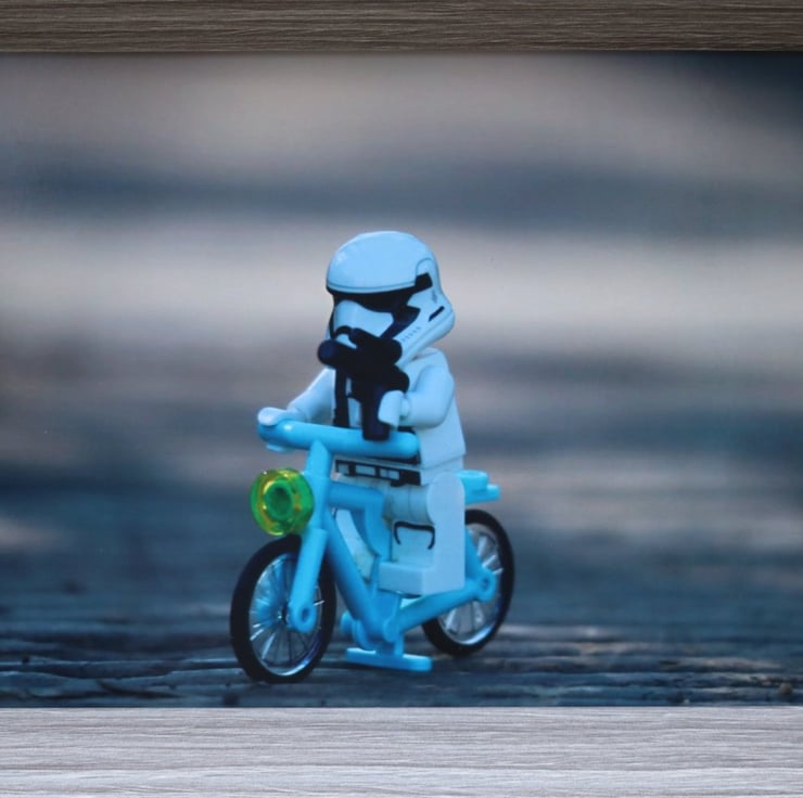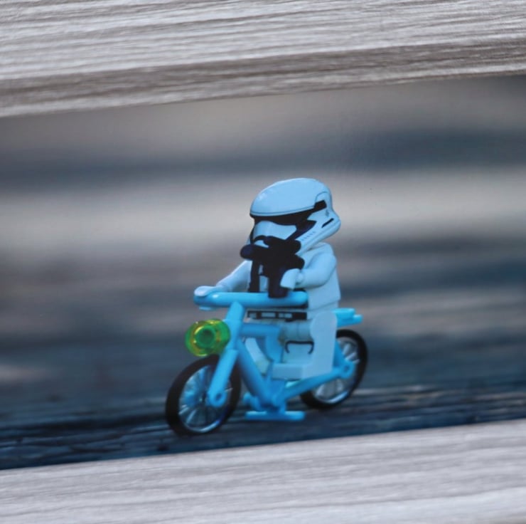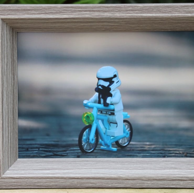 Framed photo of Lego figures. A Stormtrooper guarding the bridge on his bike.