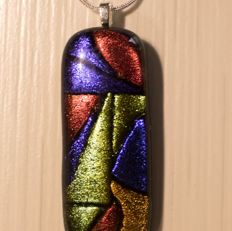 This pendant design uses multi-coloured dichroic glass, with blues, golds, greens and reds, sparkling in the light.