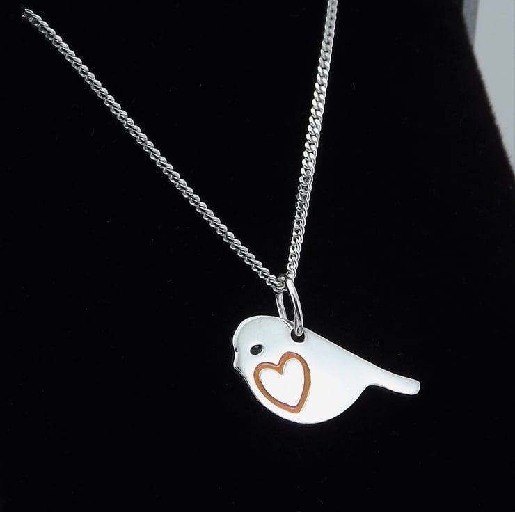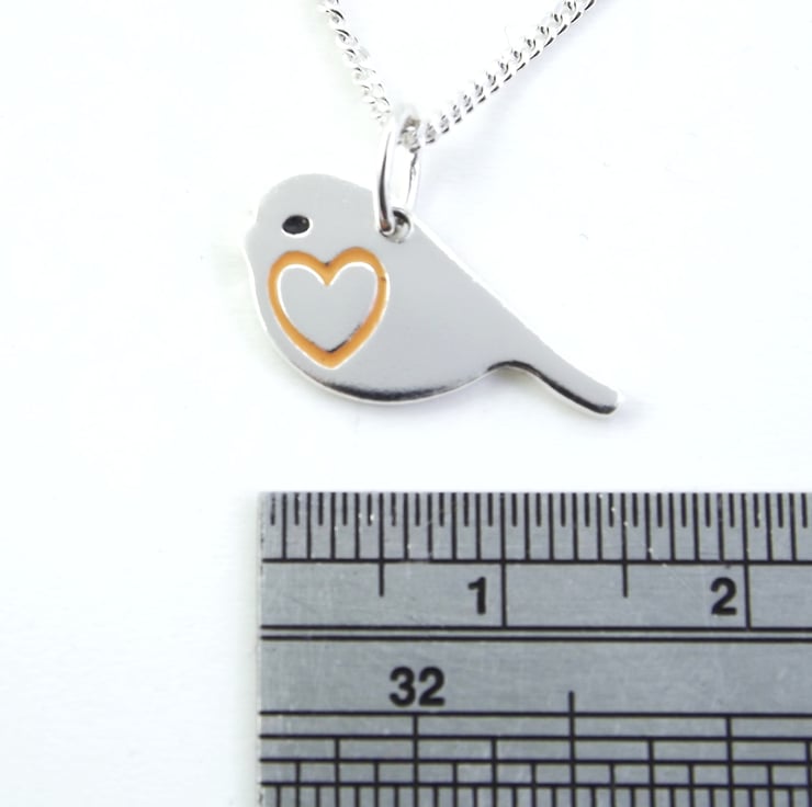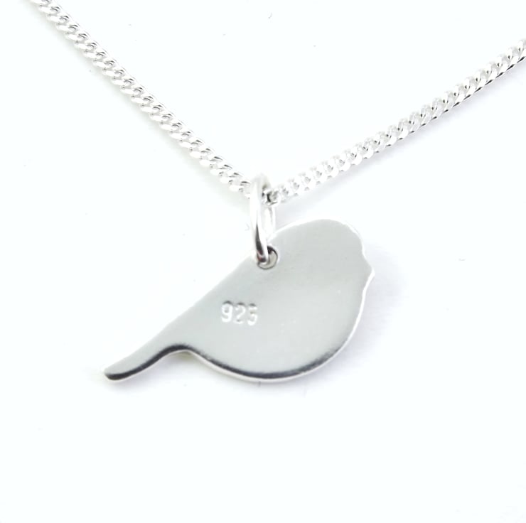This silver robin pendant has been lovingly crafted by hand. It is made from sterling silver sheet and is etched before being cut out, the edges are then smoothed using files and emery paper before it's carefully given there shape using a punch and hammer. A 5mm oval jump ring is then attached. Black and orange resin based enamels are added to the etched areas and the piece is then polished before being attached to a chain.