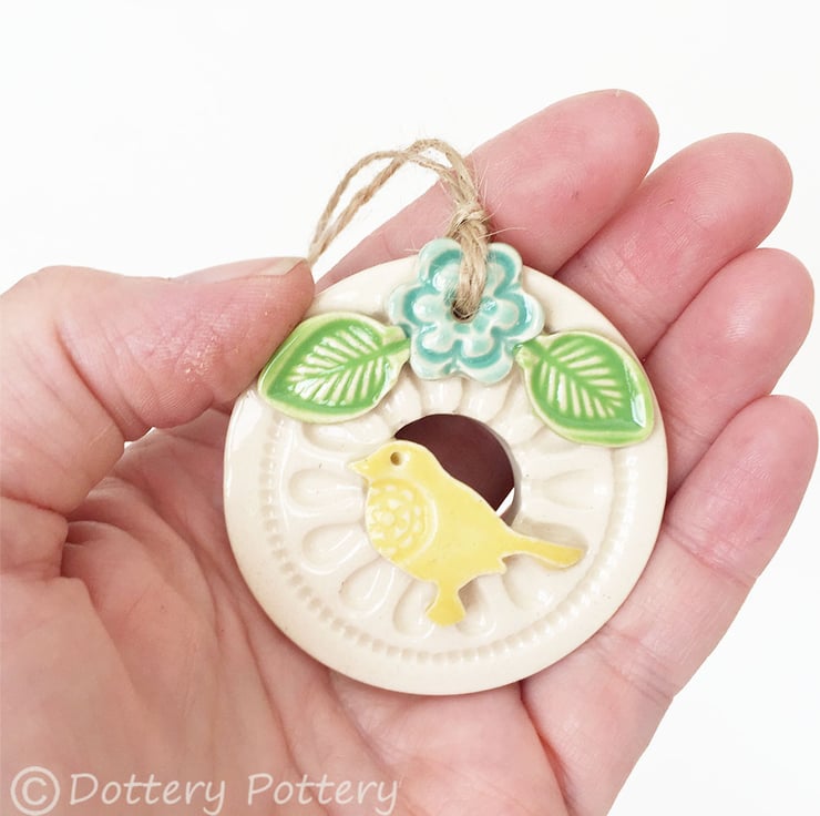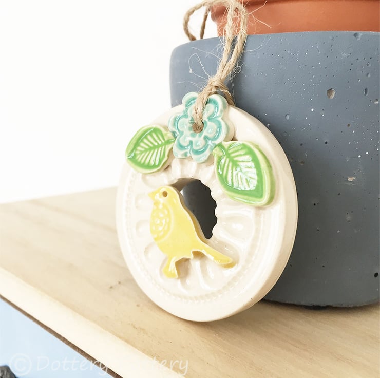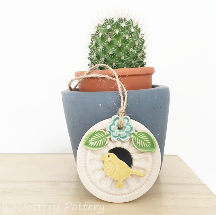 This little bird house decoration is made from white earthenware clay and finshed with a little flower and a bright bird. It has been fired twice and finished with a glossy glaze for a lovely smooth finish. It measures 5.5cm diameter and hangs from rustic brown string