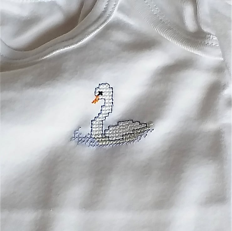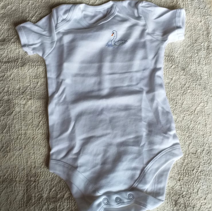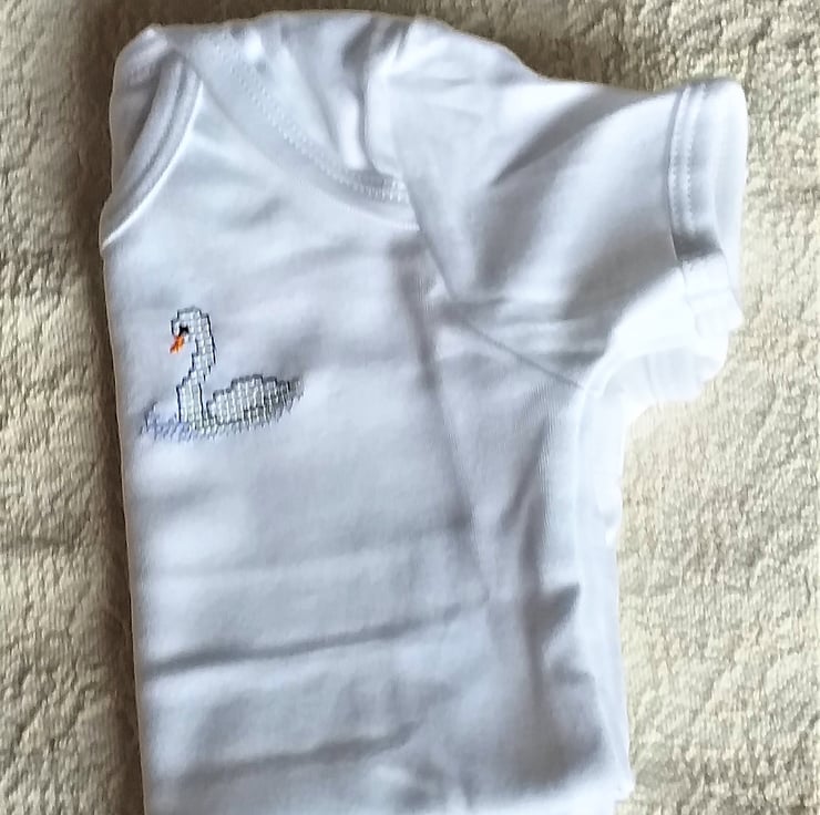 I have made a soft white baby vest/onesie special by hand embroidering a graceful swimming swan on the front. The vest has an envelope neck, short sleeves and three press studs between the leg openings. It is 100% cotton and can be machine washed.