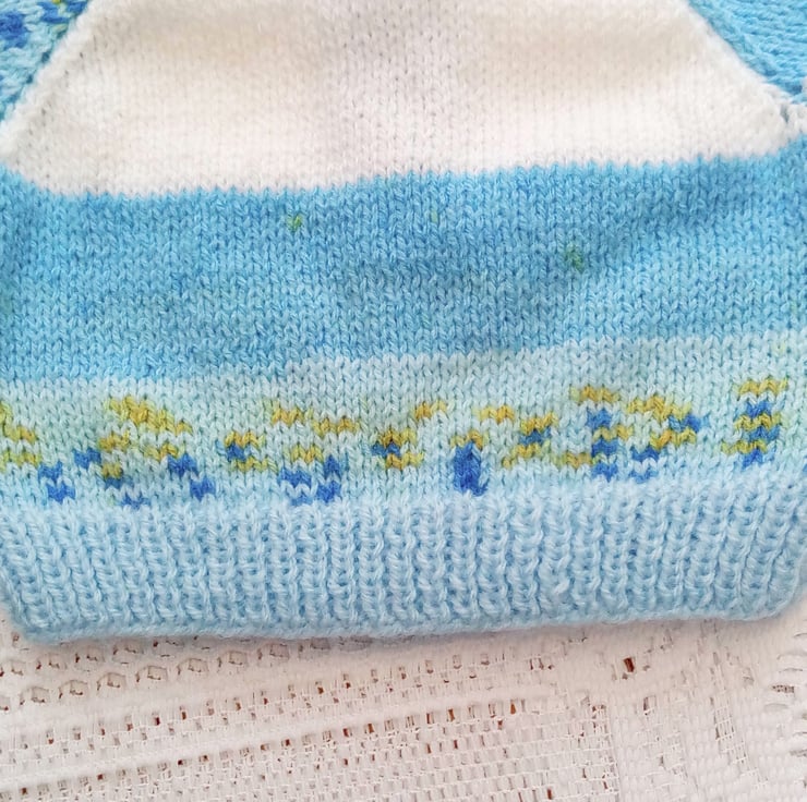 The sweater is in stock to fit a 0 - 3 month old baby with a 16 inch chest, in the shades of blue and white shown in the photos. It would make an ideal gift for a baby shower, a new born baby or as a Christening gift. It would also look good on your own little one as a treat for him or her.