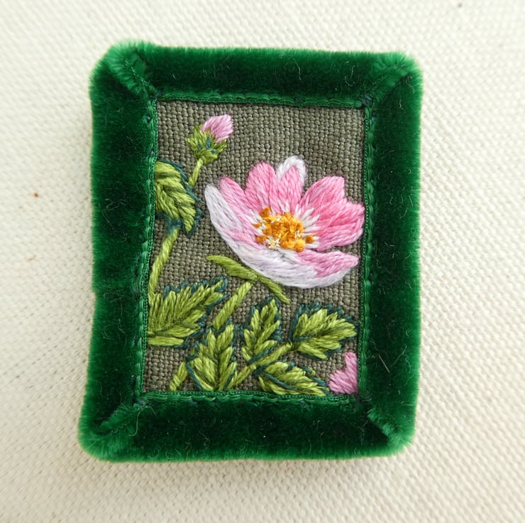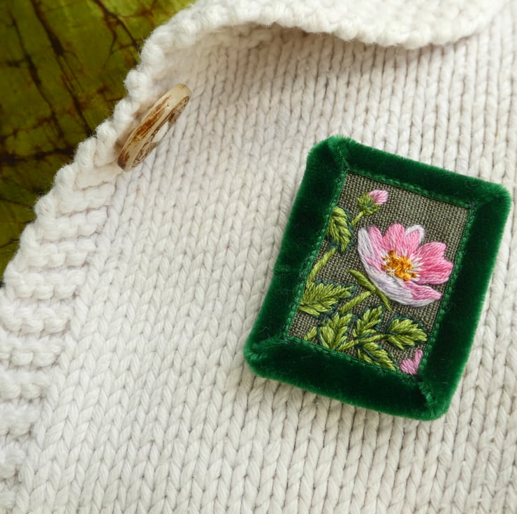 Hand embroidered brooch featuring a pink Wild Rose bloom - a little piece of wearable art.