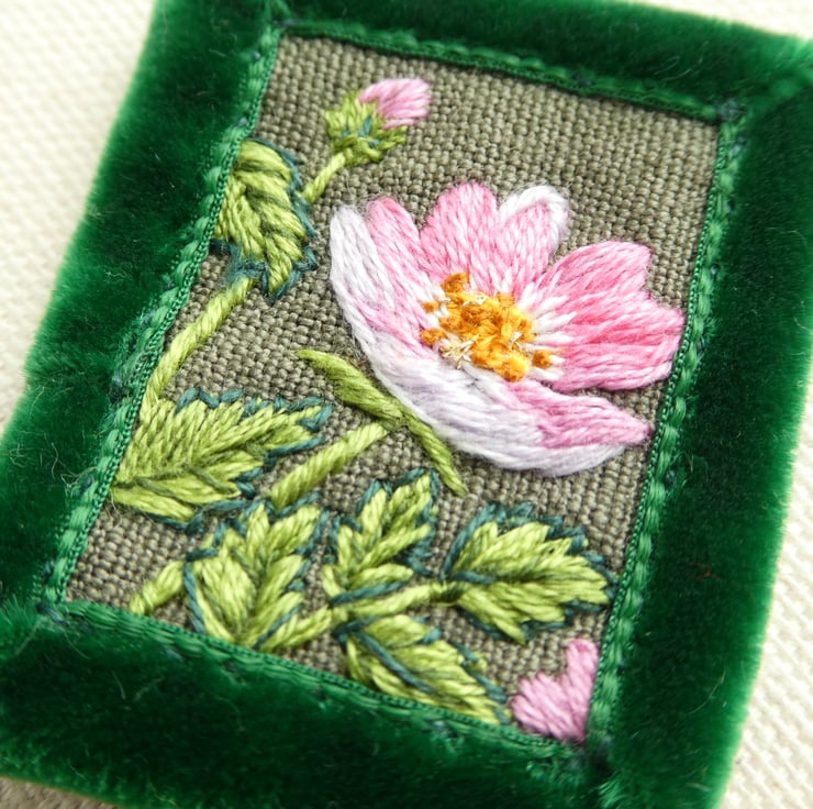 The Wild Rose, or Briar Rose, was stitched by hand using strands of embroidery thread, with a tiny touch of gold thread in the centre. The cup-shaped flower is pale pink fading to white in the centre, which is yellow-gold, and there is a little unopened bud as well. The leaves have the usual jagged edges of the Rose family. It is stitched onto a cotton background and framed with a soft velvet ribbon in a woodland green.