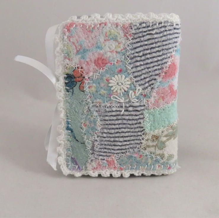 A patchwork style, hand-embroidered needle book, from vintage fabric scraps - finished with a crocheted edging.