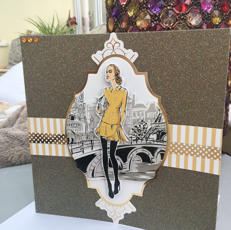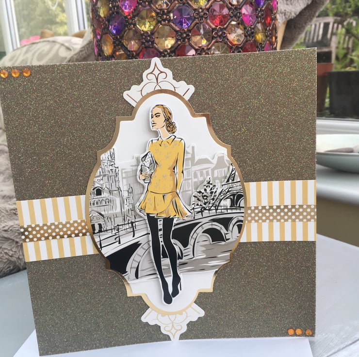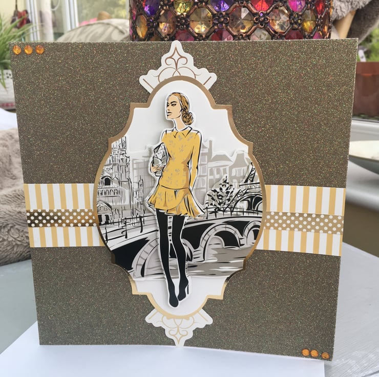 This large 8x8in glittered card has a layered topper with an elegantly attired lady in a mustard dress. It is finished off wth gold accents and amber beads. Inside has a matching insert and a Happy Birthday greeting. All from Create and Craft, greeting by Stamps by me.