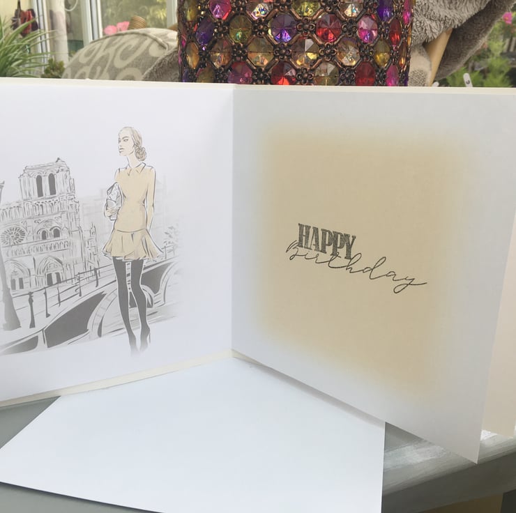 Take yourself to Paris and a stroll along the Seine. This sophisticated birthday card evokes the scene. An elegant woman strolling along in Paris, off to lunch maybe. Do you know someone who would love this modern and fresh card? Sister, mother, friend? She will love it's elegant style.