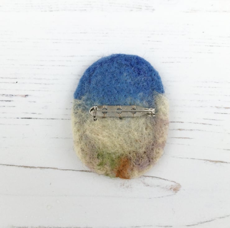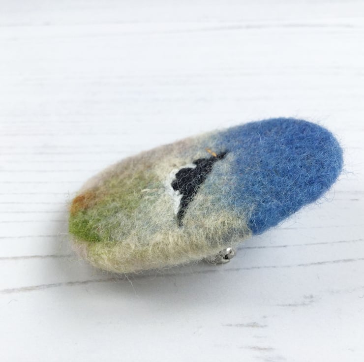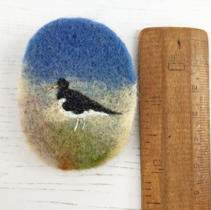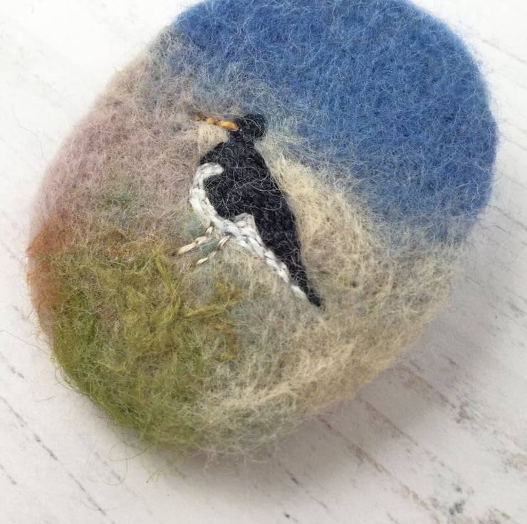 Oystercatcher embroidered brooch with a needle felted background.