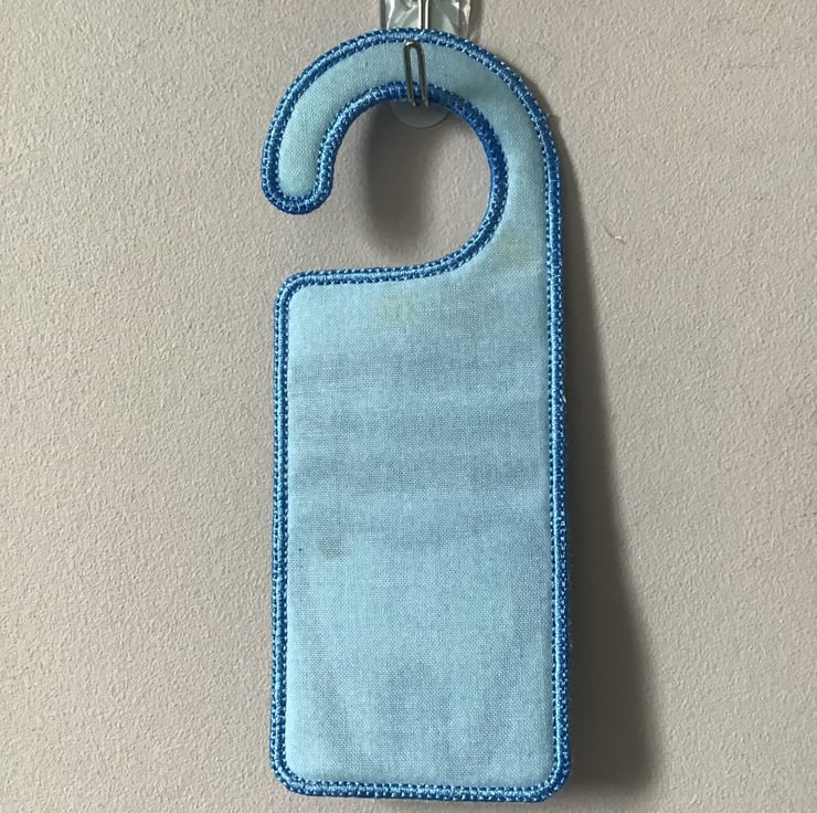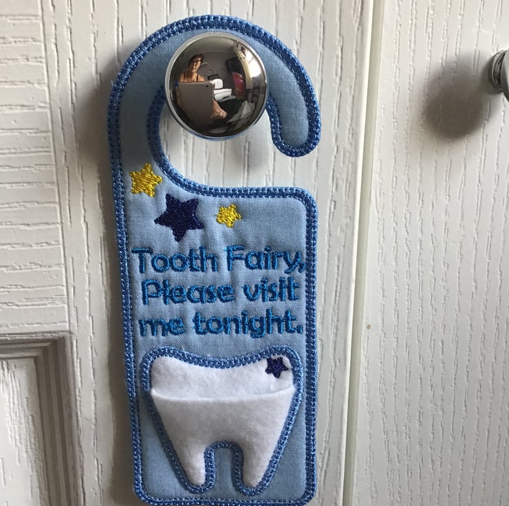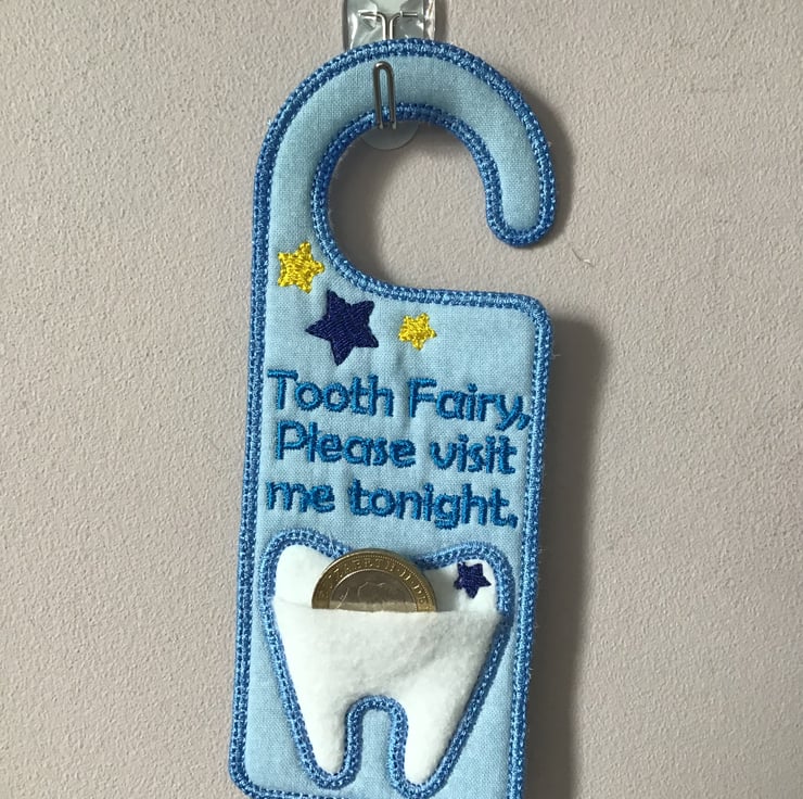This is a door hanger In pale blue, for the tooth fairy, it has a tooth pocket which can hail a £2 ,£1 or 50p coin.